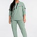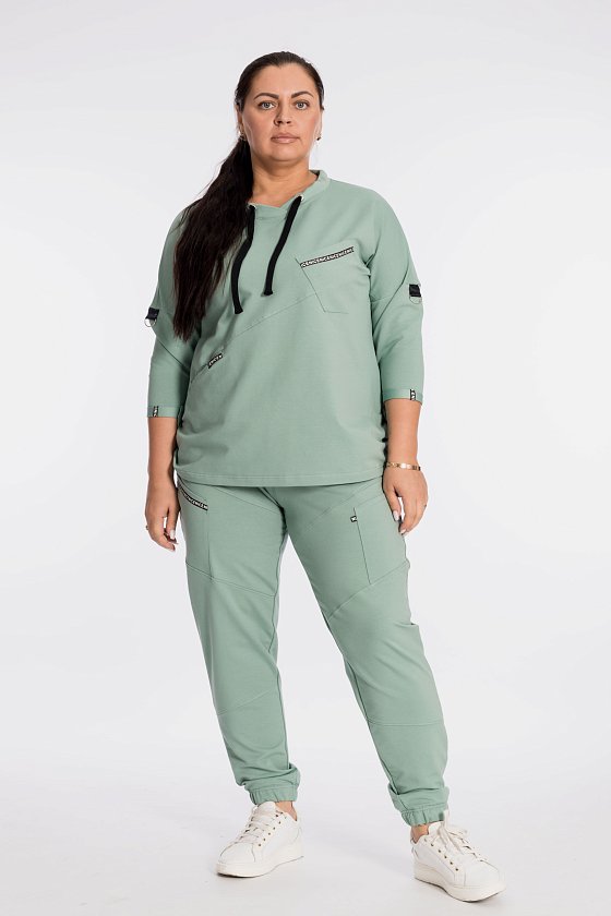 Костюм выполнен из футер петли с лайкрой. Состоит из брюк и толстовки. Толстовка со спущенной линией плеча, рукавом длиной 3/4, в горловине через люверсы проложен шнур. Спереди расположены два кармана, по низу отделка паты. Брюки с резиной на поясе и по низу, по бокам размещены карманы. Детали костюма с отделкой декоративными элементами и репсовой лентой.