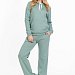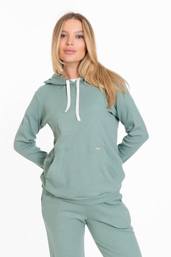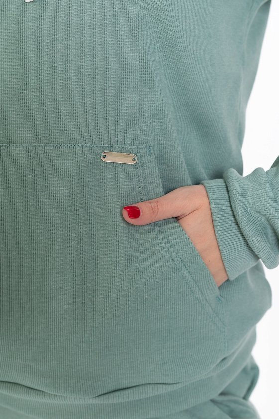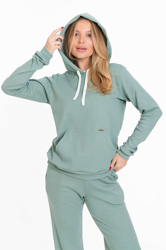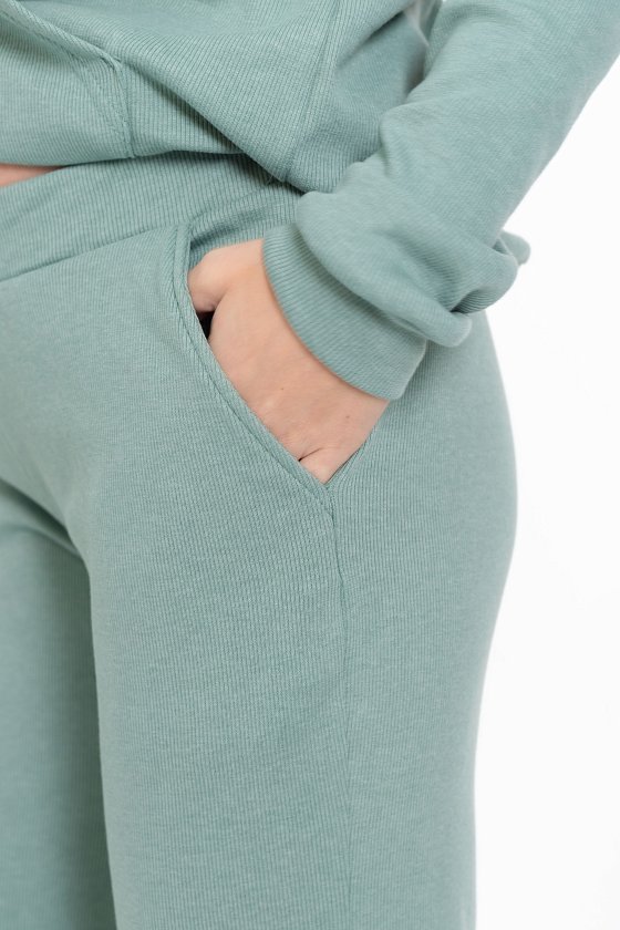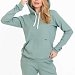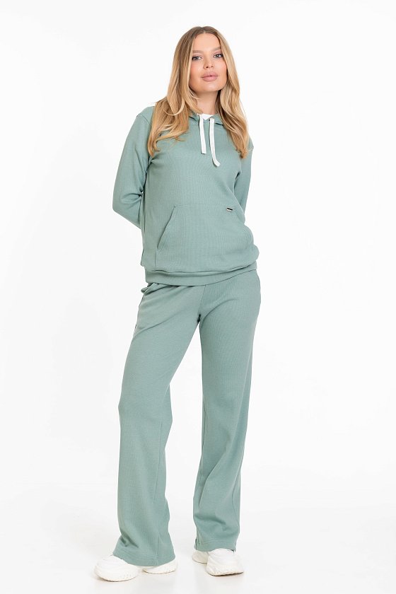Женский костюм из однотонного кашкорсе цвета ментол с начесом представляет собой уютный и стильный комплект, состоящий из брюк и толстовки.