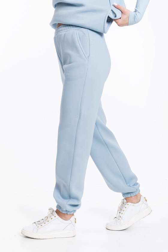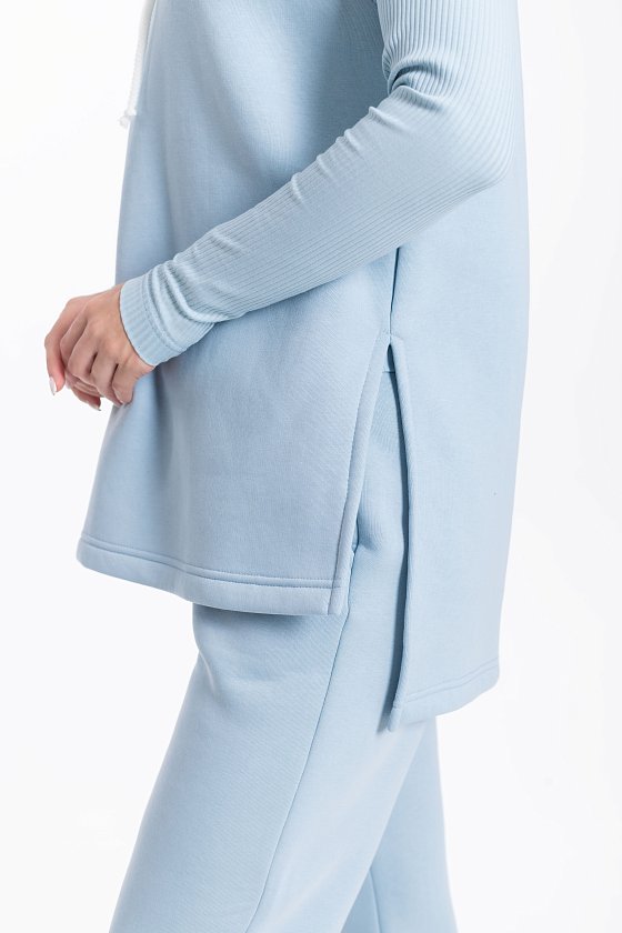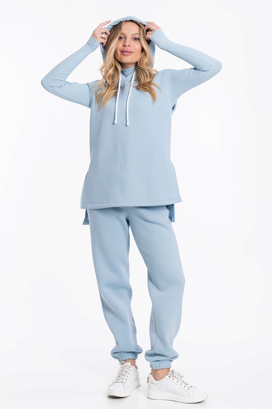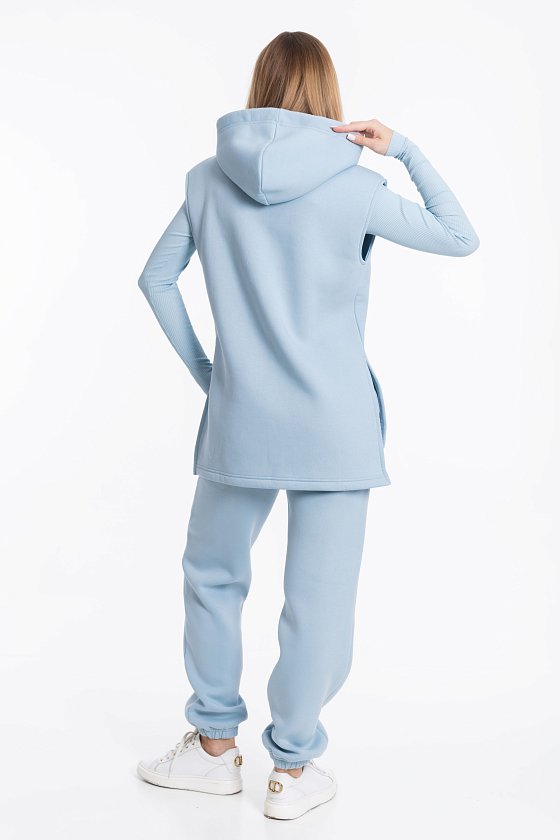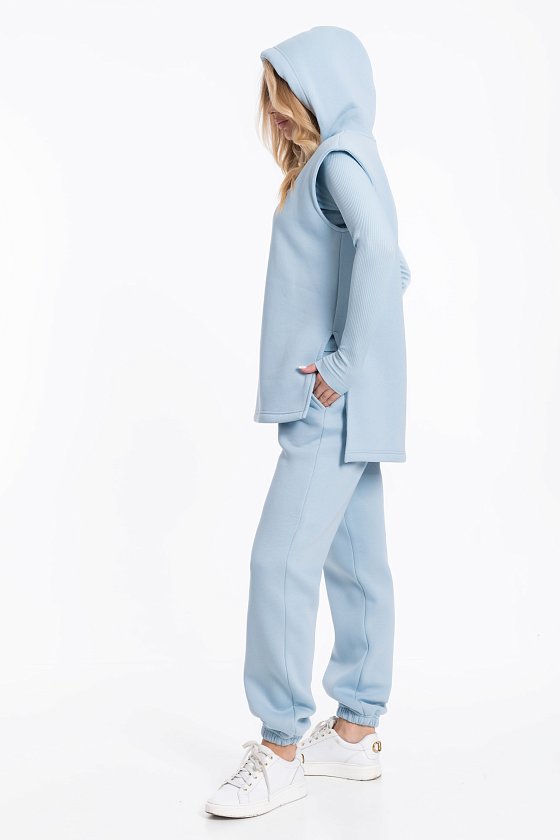 Женский голубой костюм из футера 3х нитки с начесом жилетка с капюшоном и брюки — отличный выбор для создания стильного образа. Жилетка удлиненная, свободного кроя, без рукавов. Боковые разрезы и удлинённая спинка жилетки придают изделию оригинальность. Капюшон со шнуром можно регулировать по размеру. Боковые карманы на брюках, пояс на резинке и низ штанин на резинке обеспечивают удобство.