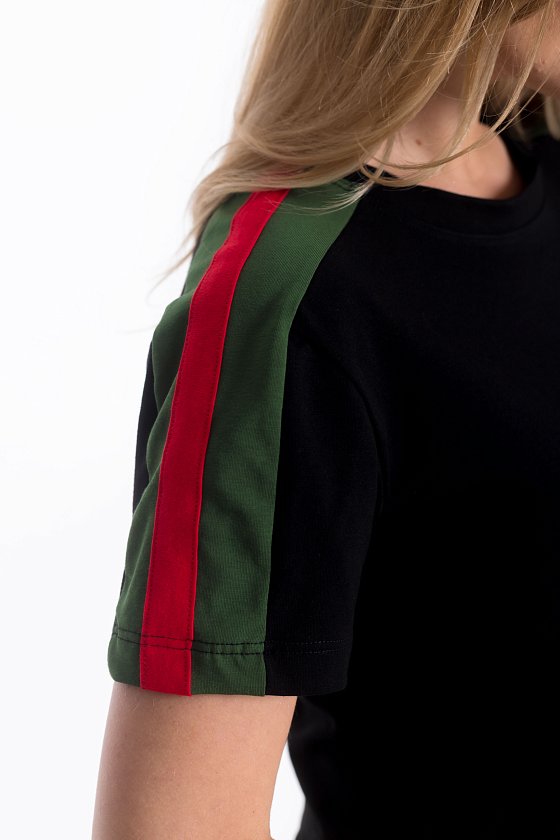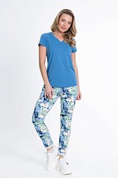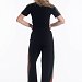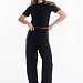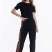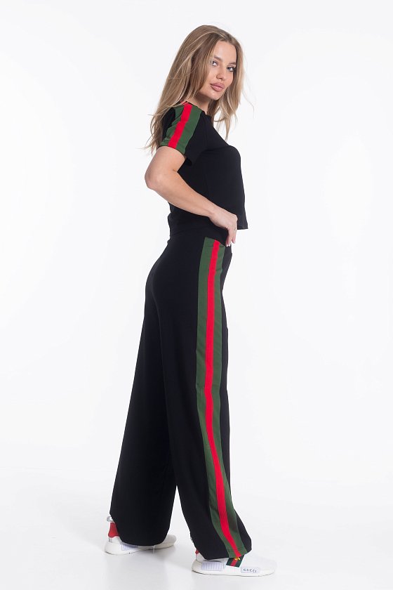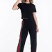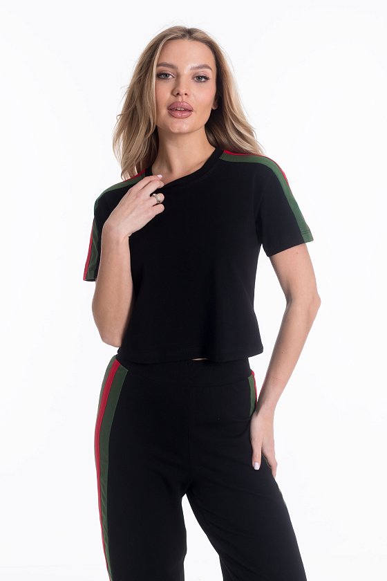 Женский костюм из х/б полотна с добавлением лайкры — отличный выбор для повседневной носки. Укороченная футболка с круглым вырезом горловины обеспечивает свободу движений, а свободные брюки с поясом на резинке и боковыми карманами гарантируют комфорт. Лампасы контрастного цвета на рукавах и брюках добавляют изюминку в дизайн костюма. Такой наряд подойдёт для прогулок, неформальных встреч или отдыха.