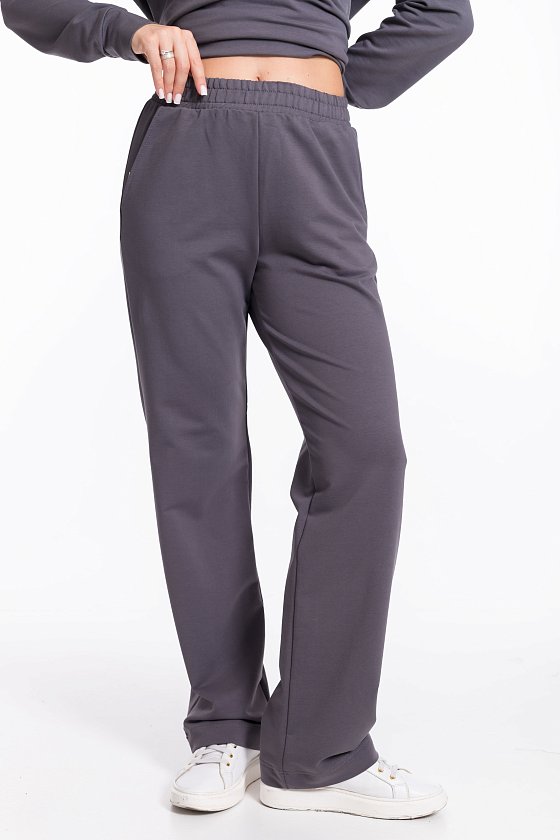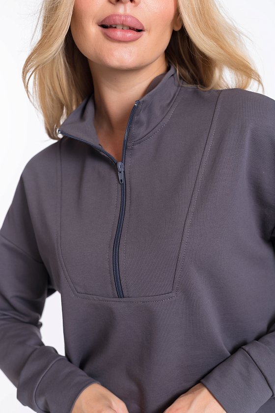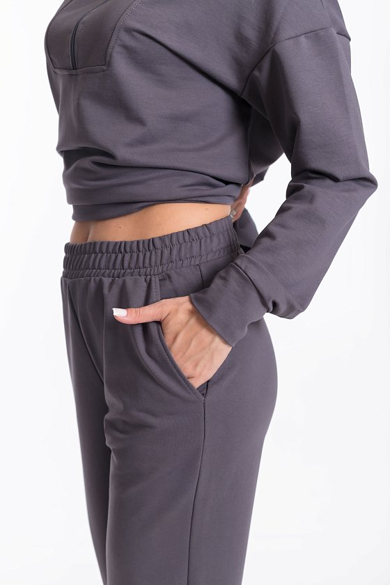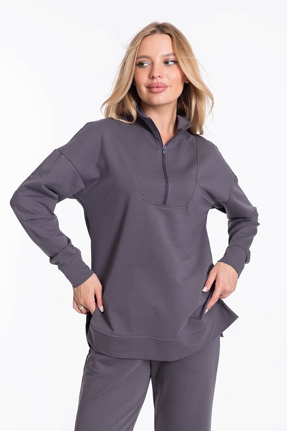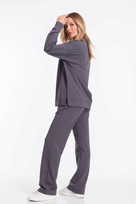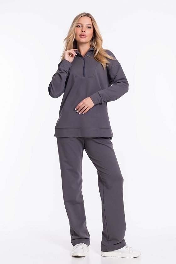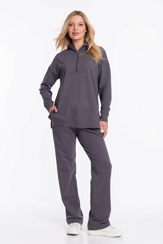Женский костюм из футера с лайкрой — отличный выбор для повседневной носки. Толстовка свободного кроя с разрезами по бокам и удлинённой спинкой обеспечивает свободу движений, а воротник-стойка с застёжкой на молнию и спущенные рукава добавляют изделию стильный вид. Брюки свободного кроя с широким поясом на резинке и боковыми карманами также обеспечивают комфорт при носке. Костюм выполнен в сером цвете, что позволяет сочетать его с различными элементами гардероба.