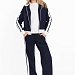 Брюки слегка свободные с боковыми карманами и поясом на резинке обеспечивают комфортную посадку. Лампасы белого цвета делают модель более яркой и запоминающейся.
