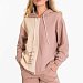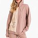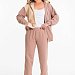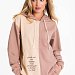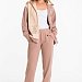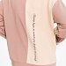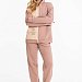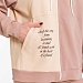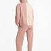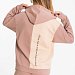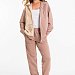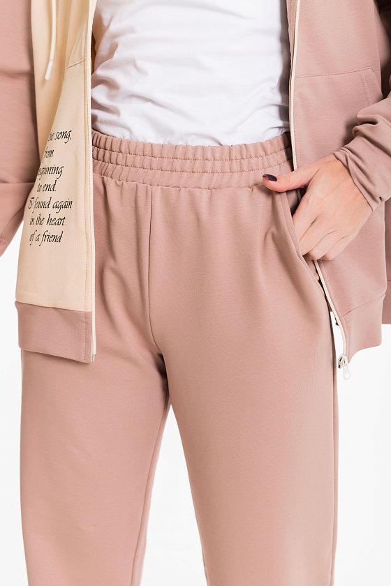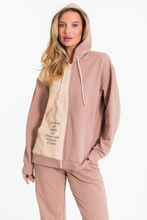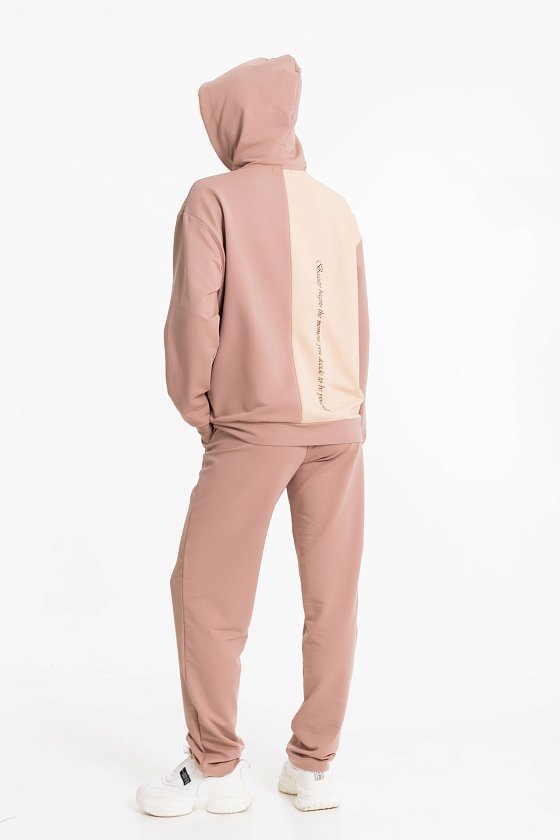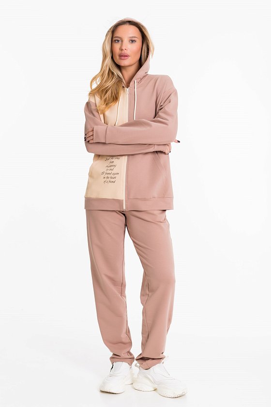 Женский костюм выполнен из однотонного футера с лайкрой двух цветов и состоит из толстовки и брюк. Толстовка с центральной застежкой на молнию, капюшоном и карманами кенгуру. Спереди и на спинке нанесён принт. Брюки с боковыми карманами и притачным поясом на резинке.