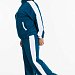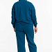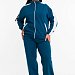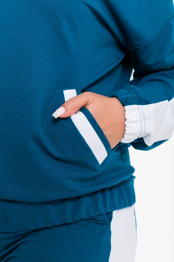 Костюм выполнен из футерного полотна, состоит из свободных по ширине низа брюк и толстовки со спущенной линией плеча. Низ рукавов и толстовки на резинке. Воротник стойка, по центру застежка на молнию. Брюки с карманами по бокам, в пояс вставлена резинка.