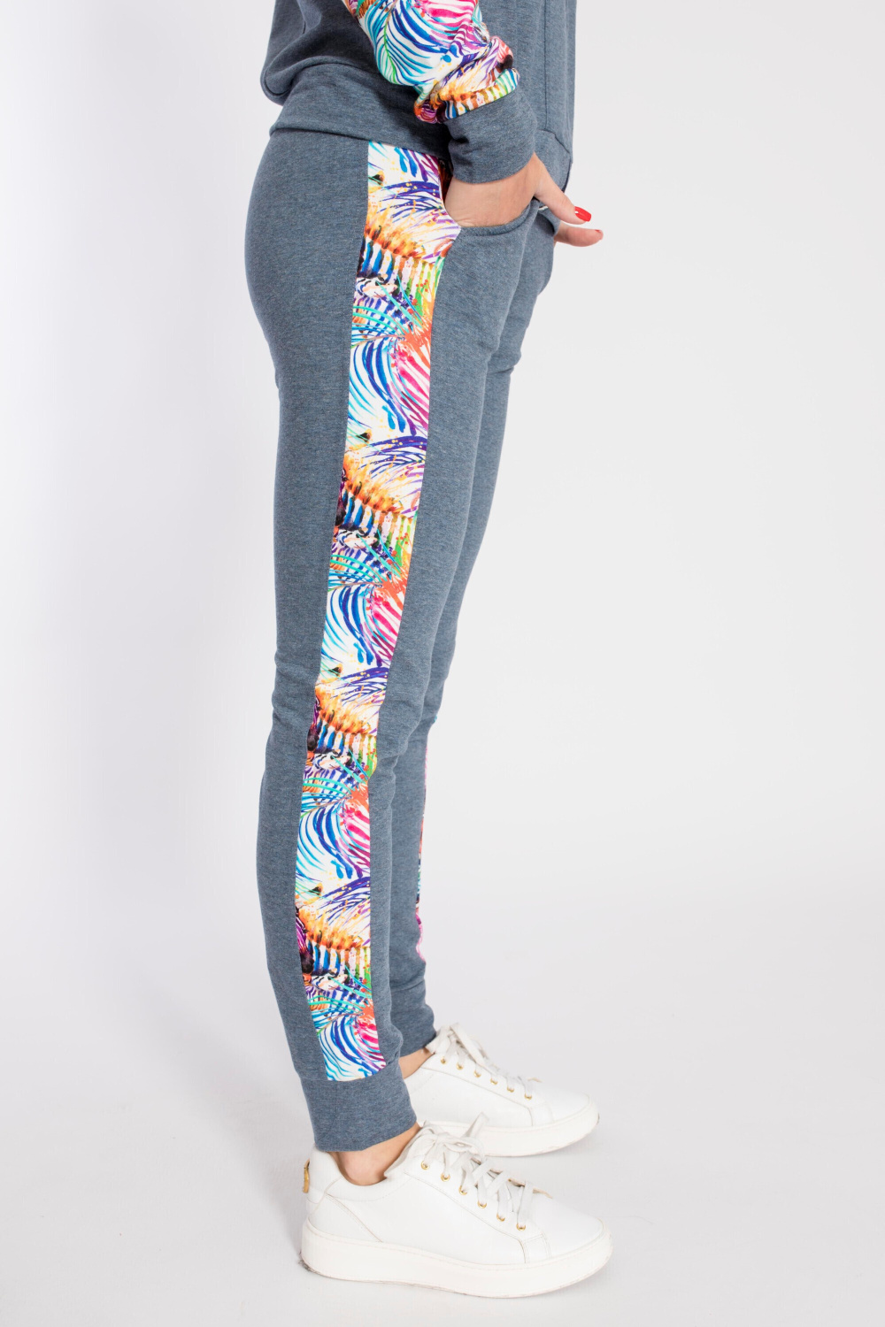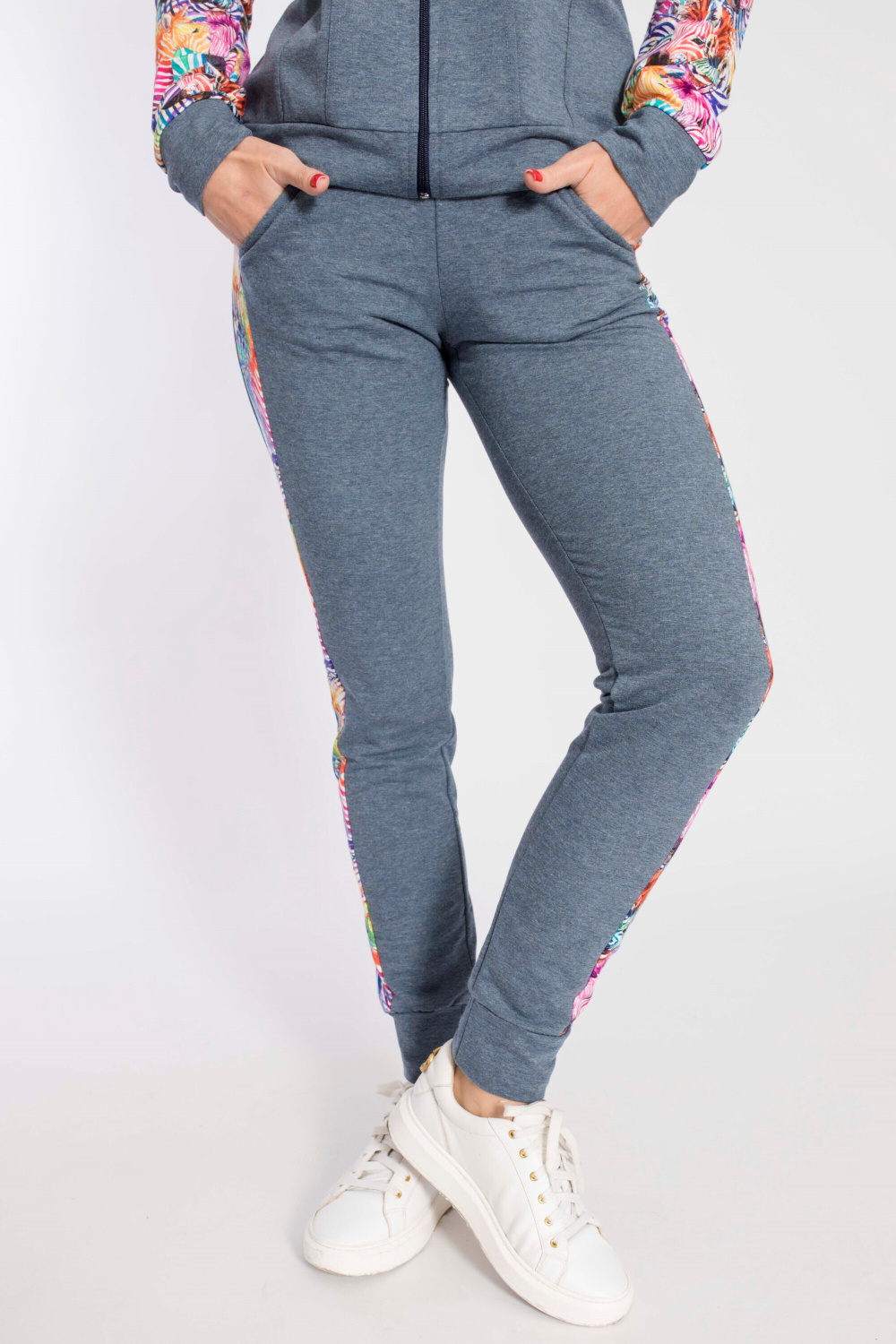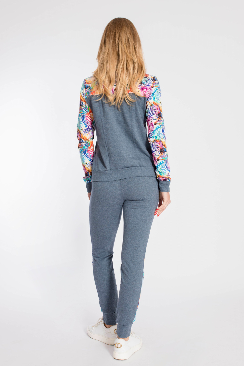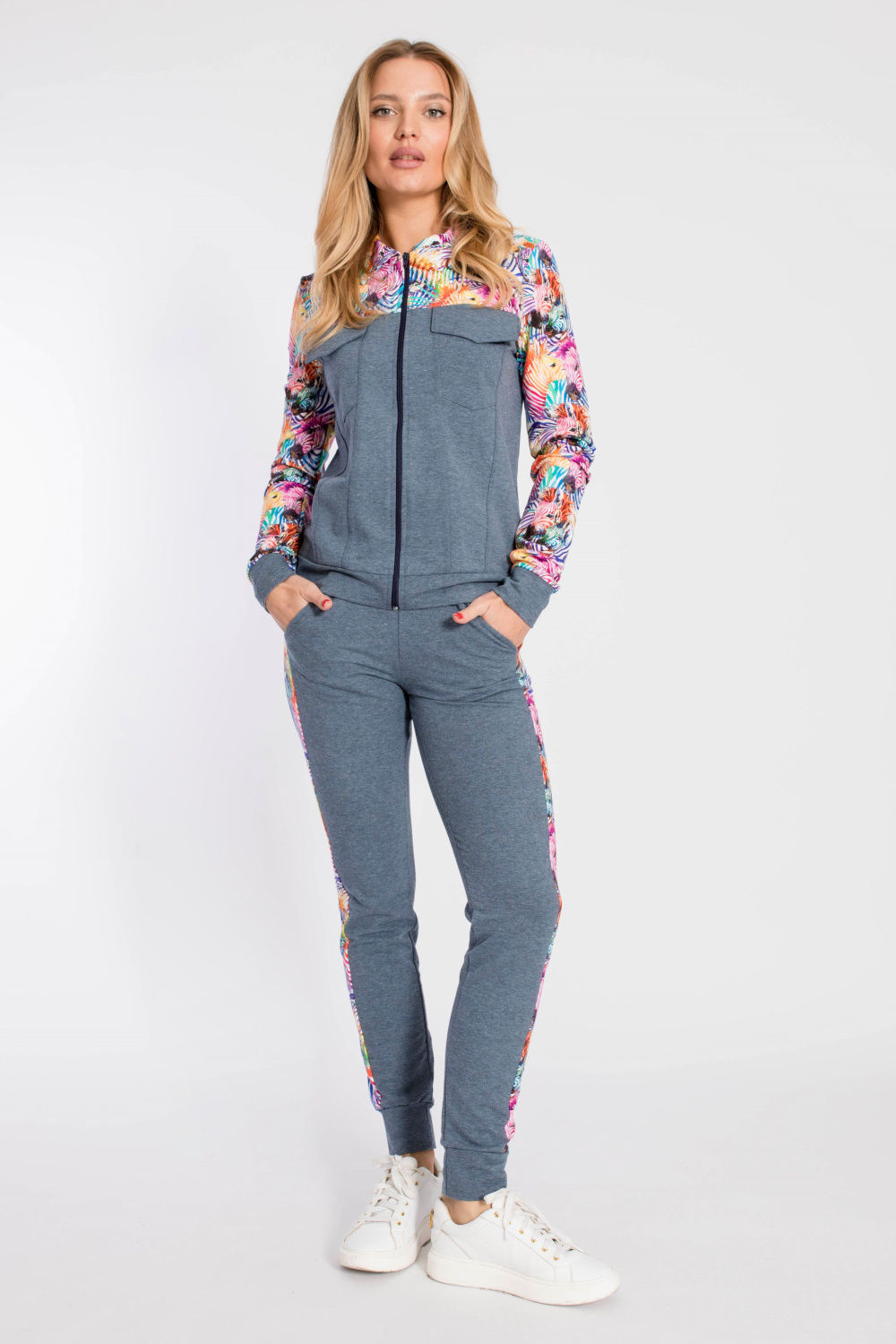 Костюм выполнен из футер петли с лайкрой, состоит из брюк и толстовки с застёжкой на молнию. Основное полотно однотонное, отделочные элементы из полотна с набивным рисунком. Брюки с поясом на резине и манжетами внизу, по бокам размещены карманы. Толстовка с отложным воротником, притачным поясом и манжетами. Спереди два кармана.