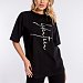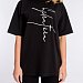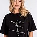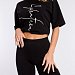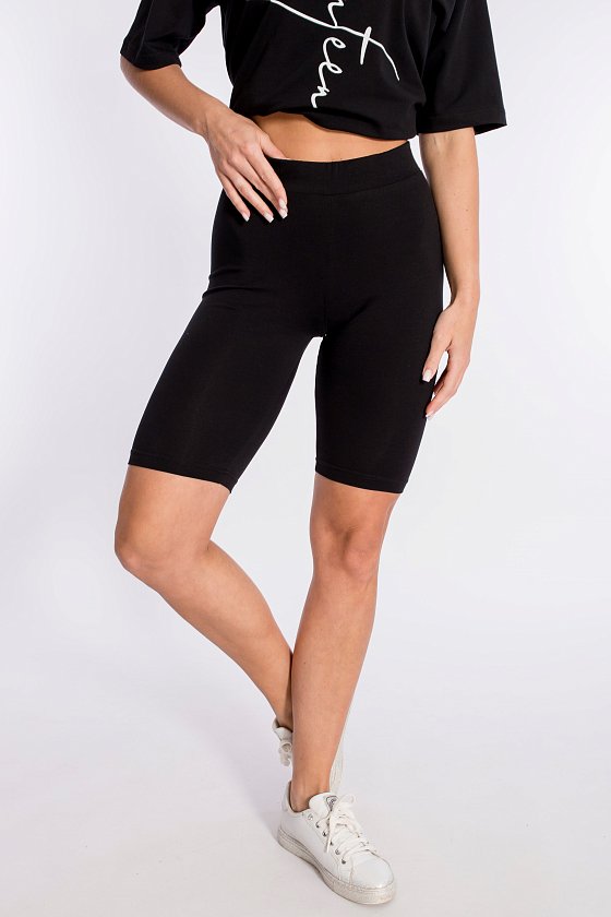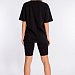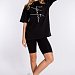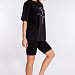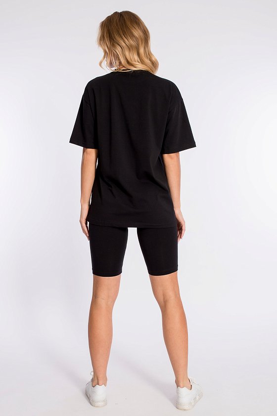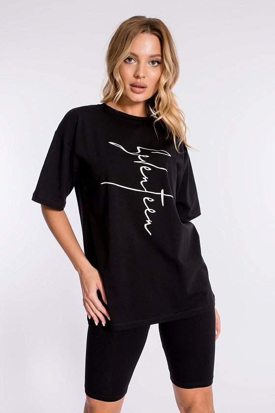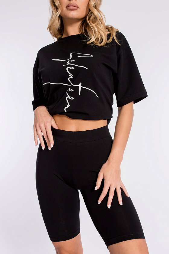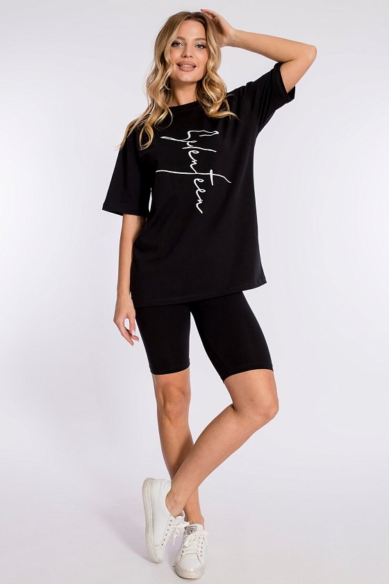 Костюм выполнен из однотонной кулирки с лайкрой. Состоит из велосипедок и футболки. Велосипедки с притачным поясом. Футболка свободная, длинная, с принтом спереди.