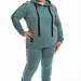 Спортивный костюм из однотонной футер петли с лайкрой. Состоит из брюк и толстовки. Толстовка свободного покроя, с рукавом реглан, капюшоном и собрана по низу на резинку. На брюках и рукавах настрочена лампасная тесьма. В люверсы капюшона вставлена репсовая лента. Спереди на толстовке расположена декоративная нашивка. Брюки с поясом на резинке и манжетами.
