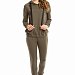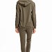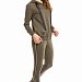 Спортивный костюм из однотонной футер петли с лайкрой. Состоит из брюк и толстовки. Толстовка свободного покроя, с рукавом реглан, капюшоном и собрана по низу на резинку. На брюках и рукавах настрочена лампасная тесьма. В люверсы капюшона вставлена репсовая лента. Спереди на толстовке расположена декоративная нашивка. Брюки с поясом на резинке и манжетами.