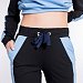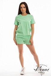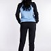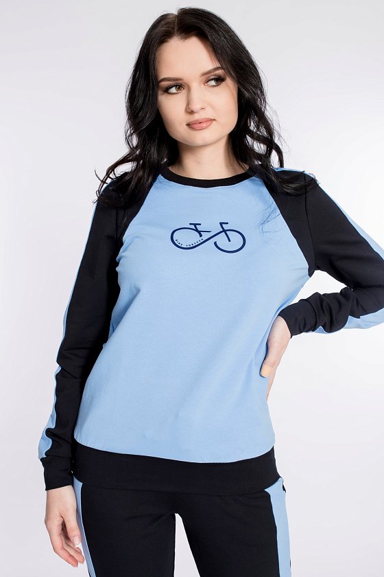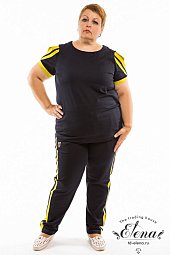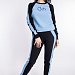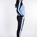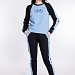 Костюм из однотонного футера с лайкрой, состоит из брюк и толстовки. Толстовка с принтом спереди. Брюки с боковыми карманами, притачным поясом с люверсами и шнуром, внизу с манжетами. На толстовке и брюках вставки из полотна отделочного цвета.