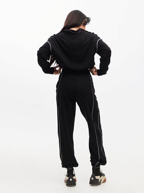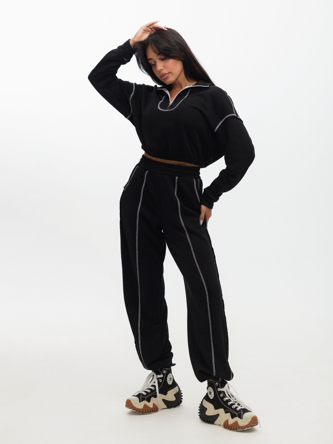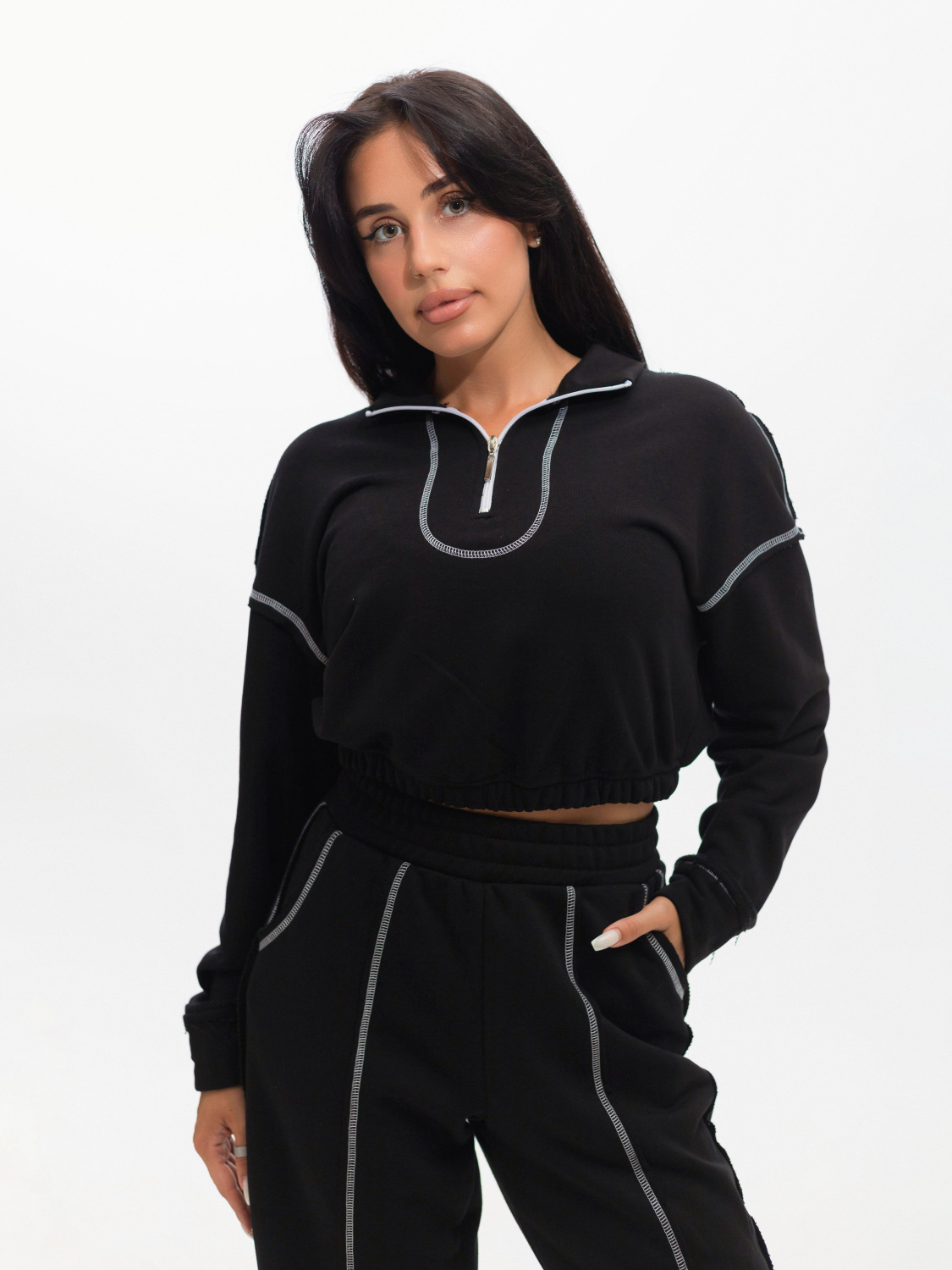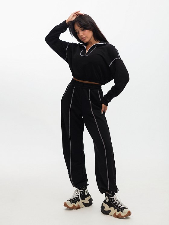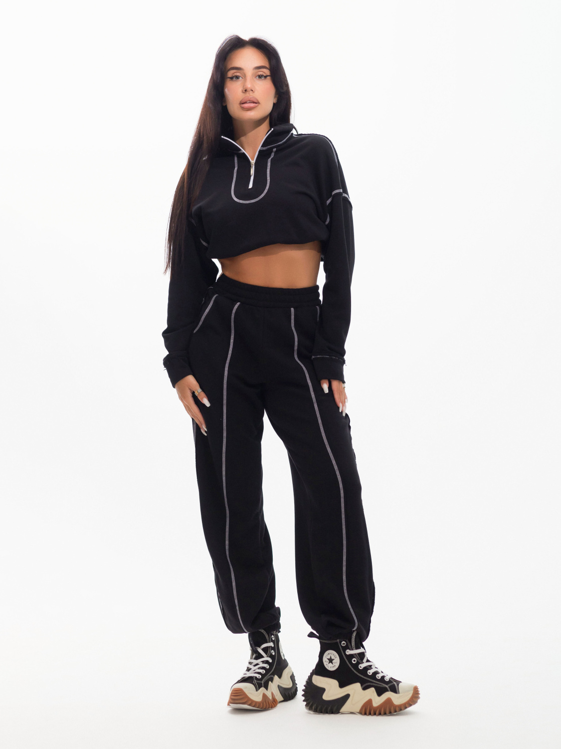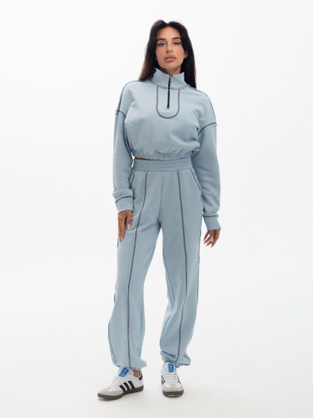Женский костюм из футера трёхнитки "диагональ" сочетает удобство и современный дизайн. Джемпер с высоким воротником на молнии, спущенным рукавом и декоративной отстрочкой смотрится стильно и подчёркивает динамичный образ. Низ джемпера собран на резинку. Брюки на комфортном поясе-резинке также украшены контрастной отстрочкой, что делает модель ещё более выразительной. По бокам размещены карманы, низ брюк на резинке. Плотный и мягкий футер сохраняет форму и дарит уют, а актуальный фасон подойдёт как для активного отдыха, так и для повседневных выходов.