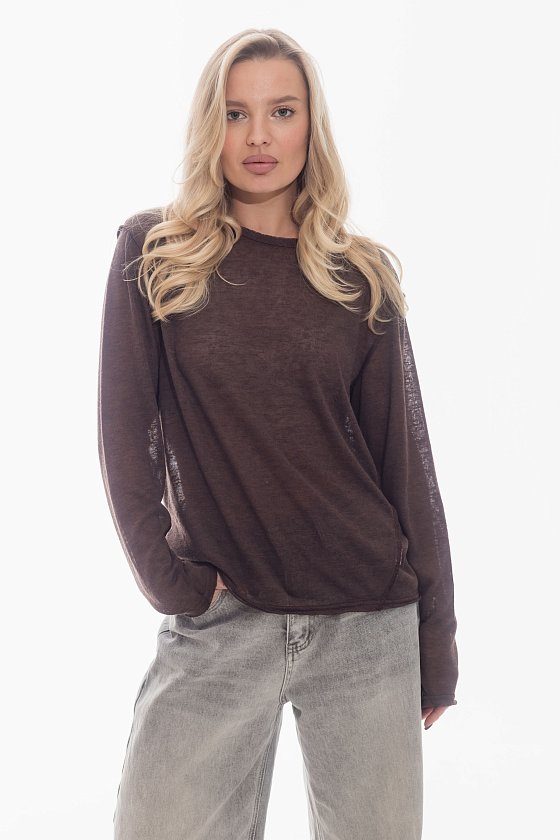Лонгслив из поливискона с втачным длинным рукавом. По горловине, низу рукавов и низу изделия выполнен эффект необработанного края. Боковые швы смещены, что придаёт модели оригинальность. Лаконичный дизайн делает лонгслив универсальной основой для повседневных образов.