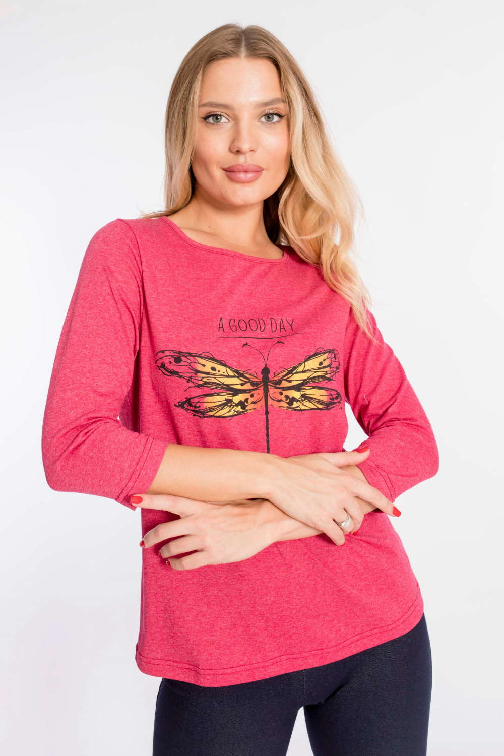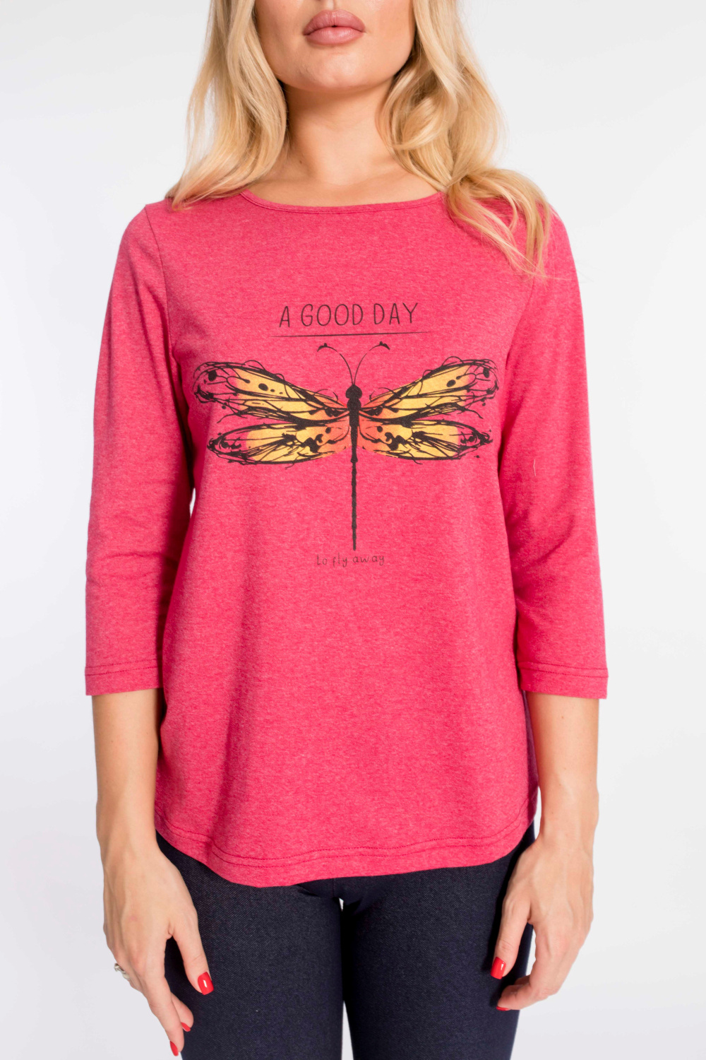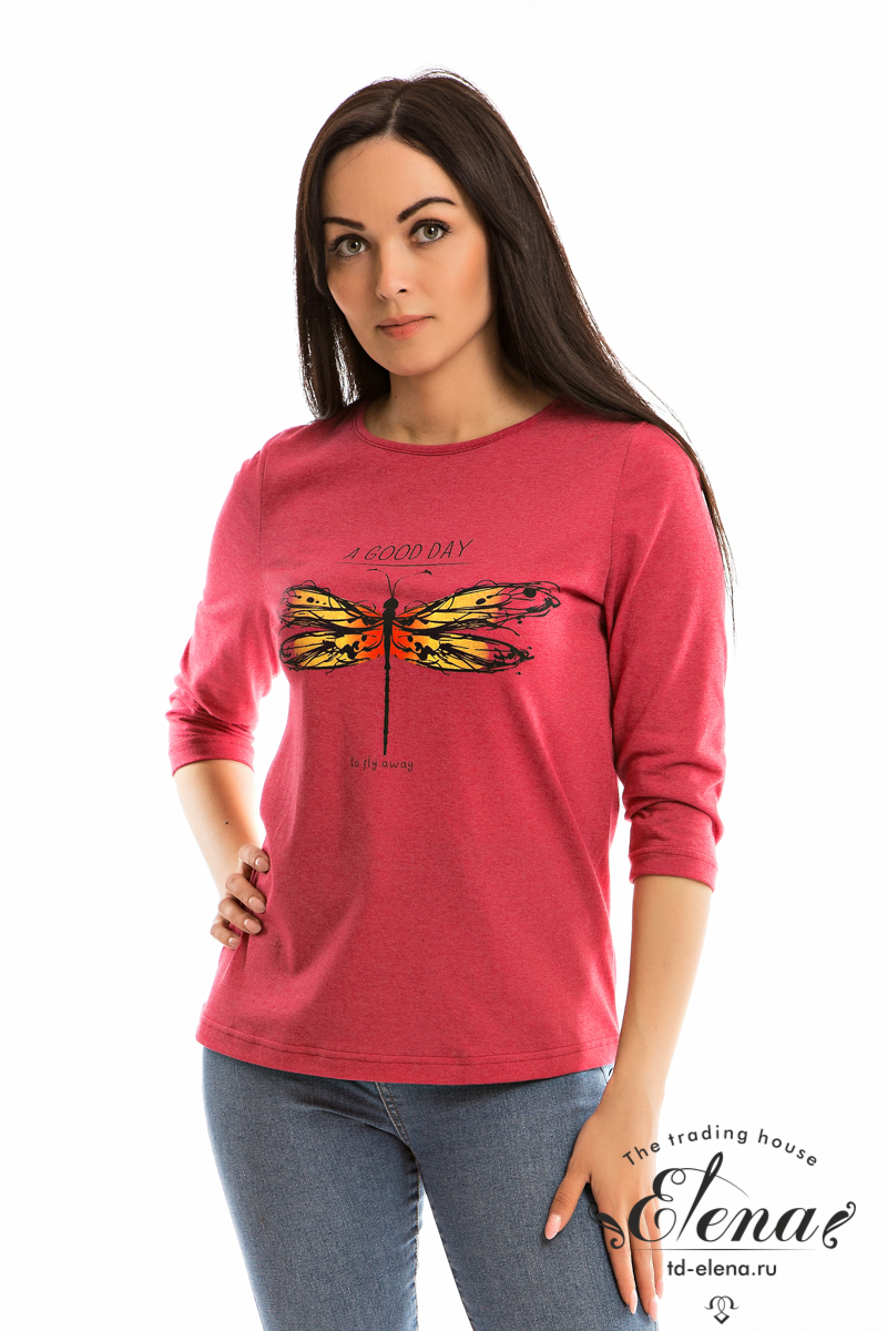 Футболка женская выполнена из кулирки. Рукава длиной 3/4, вырез горловины округлый. Спереди нанесён оригинальный принт.