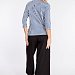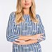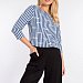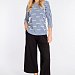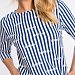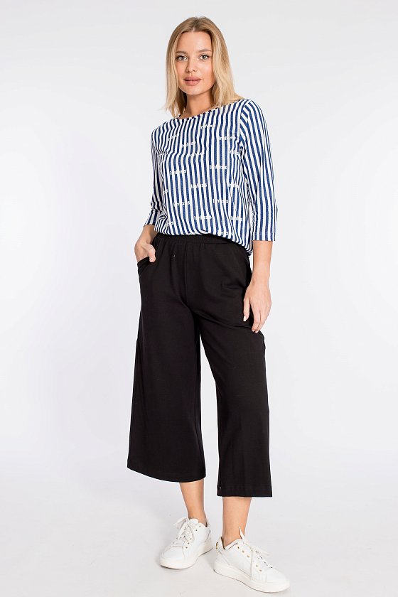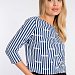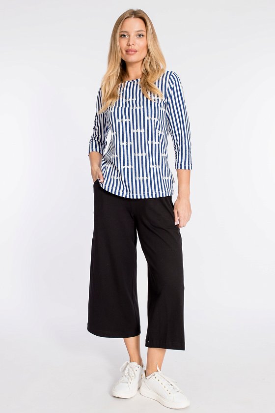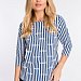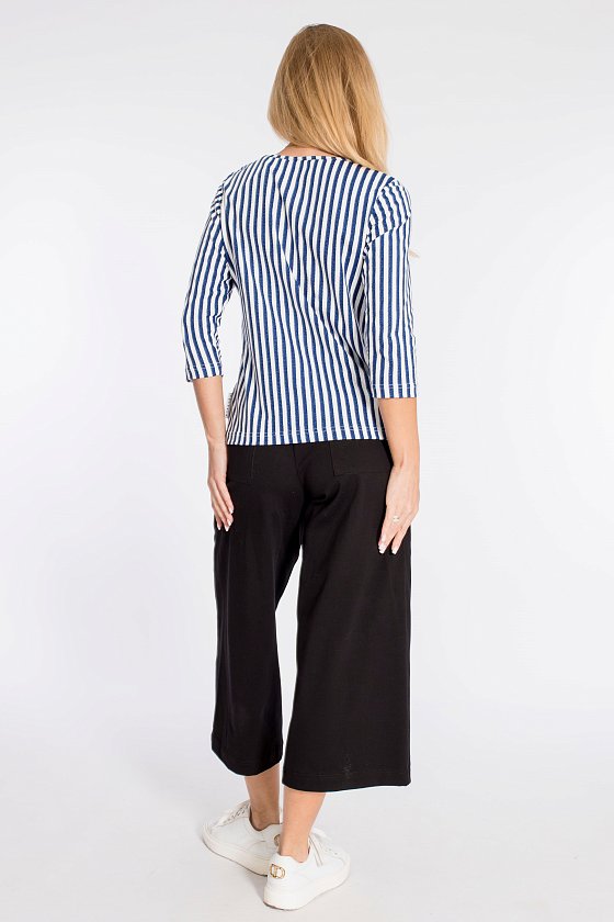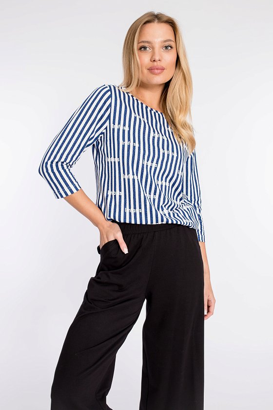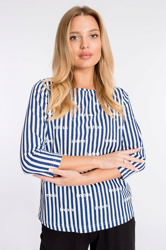 Футболка с рукавом длиной 3/4 выполнена из кулирки, рисунок "вертикальная полоска". Горловина "лодочка" обработана бейкой из основного полотна. Спереди принт, в левом боковом шве расположен фирменный флажок.
