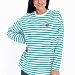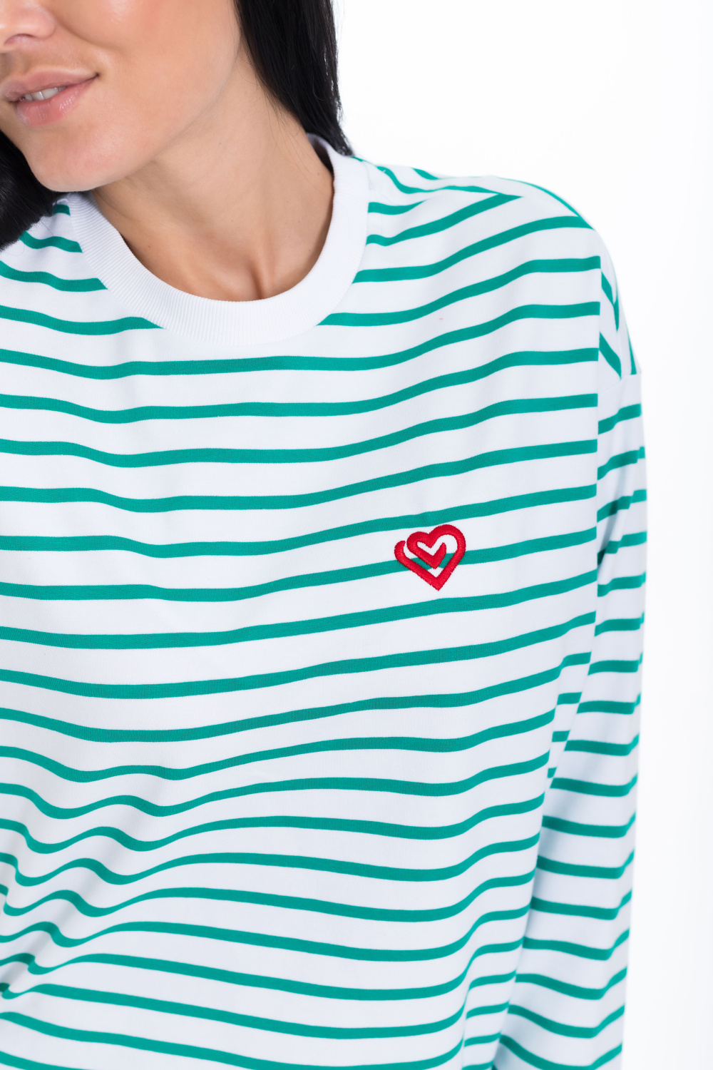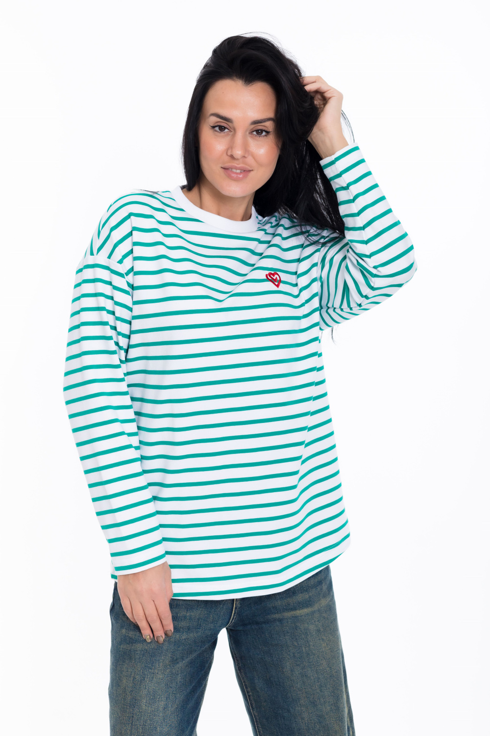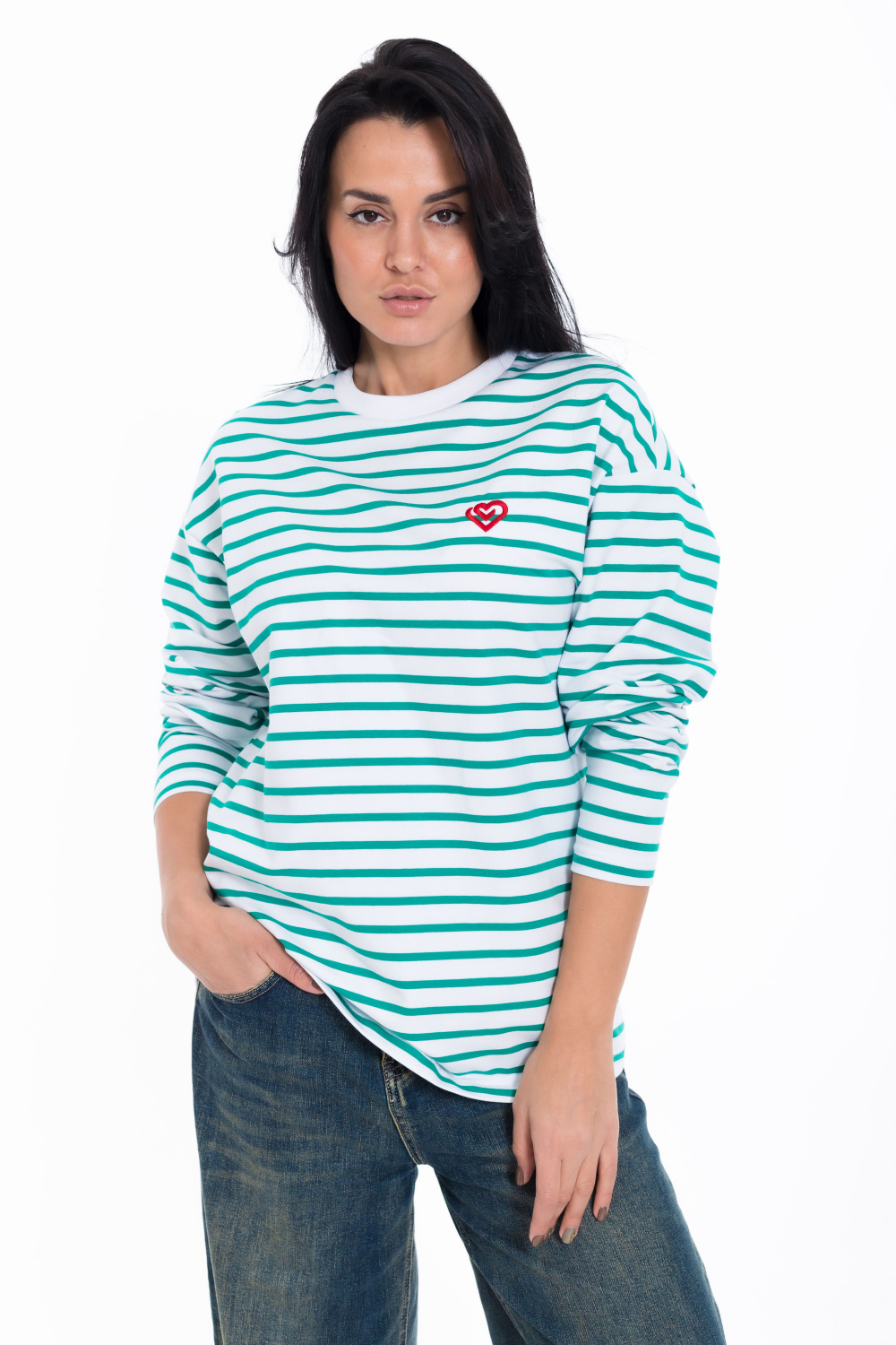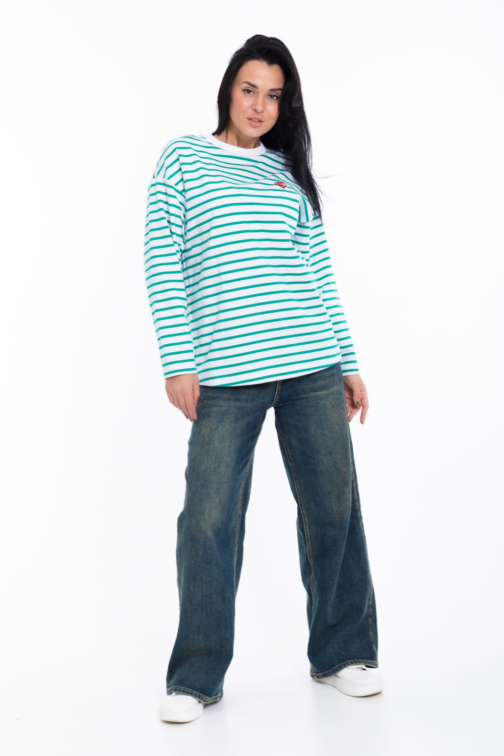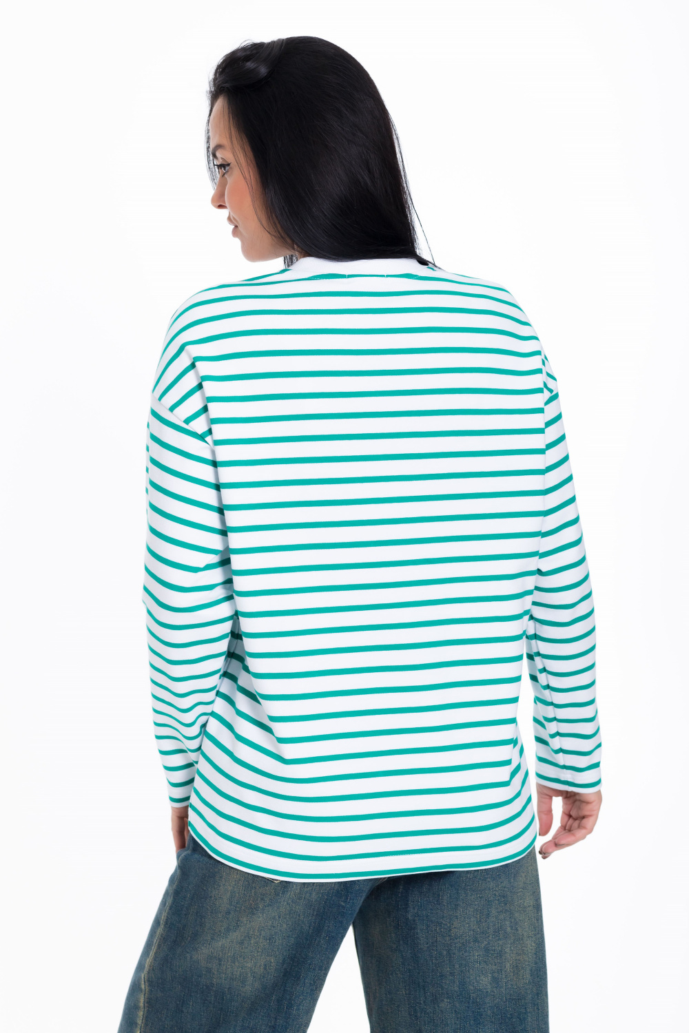 Женский лонгслив свободного кроя из белого футера с зеленой полоской - стильный и уютный вариант для повседневного образа. Удлиненные рукава и спущенная пройма добавляют современный и актуальный вид изделию.