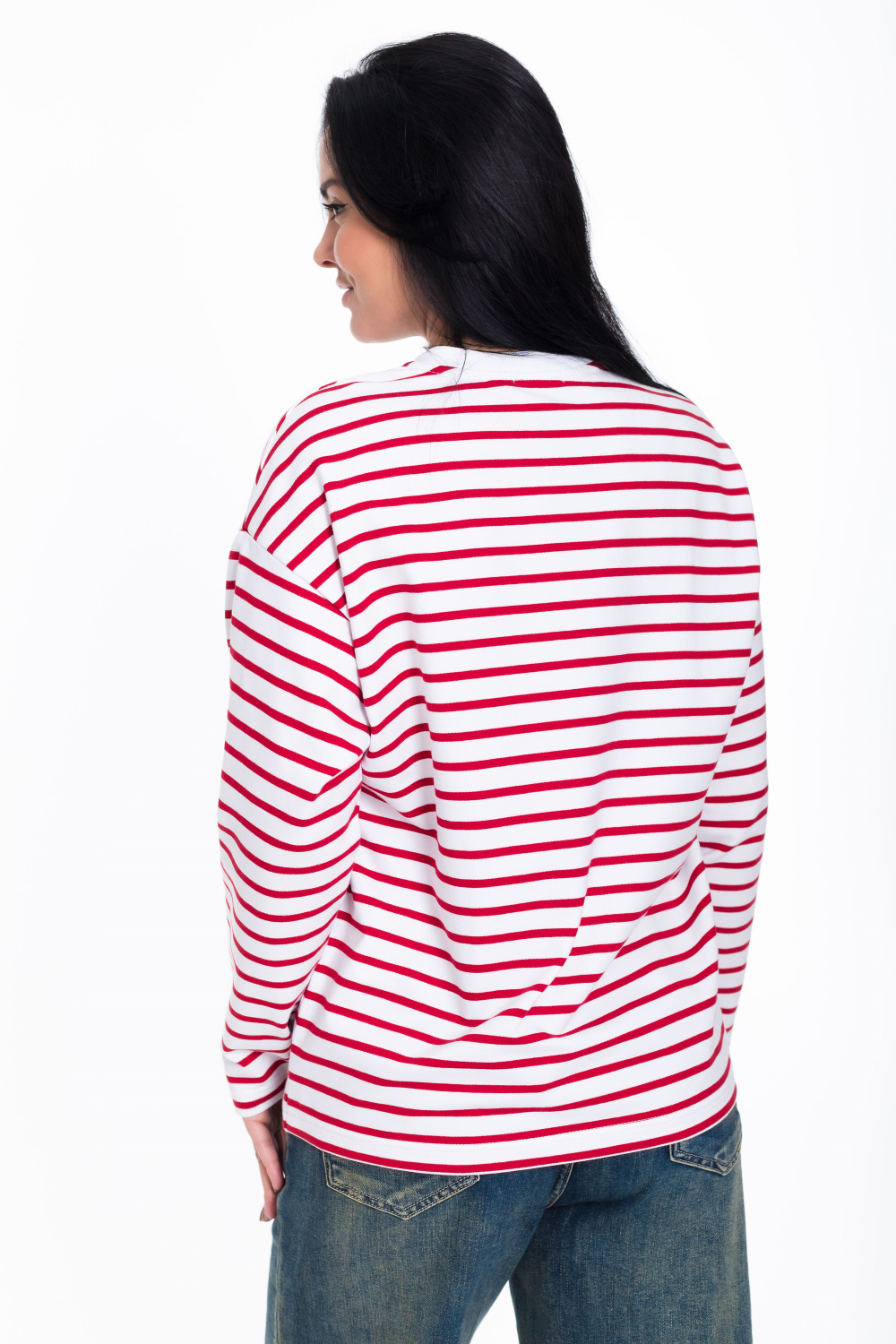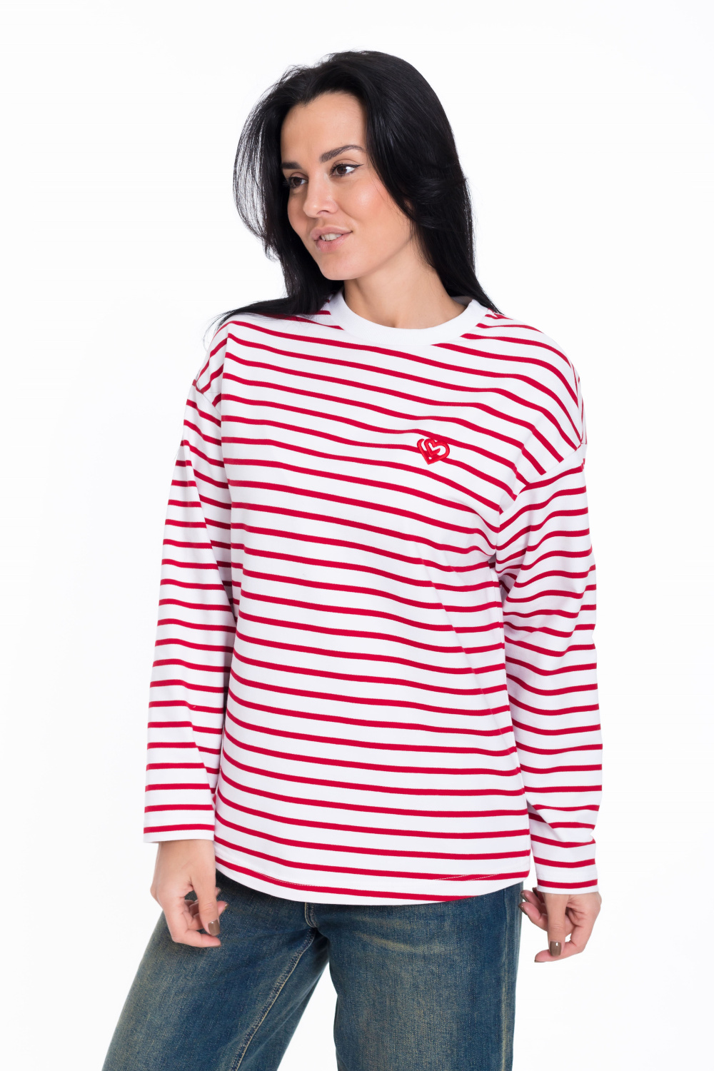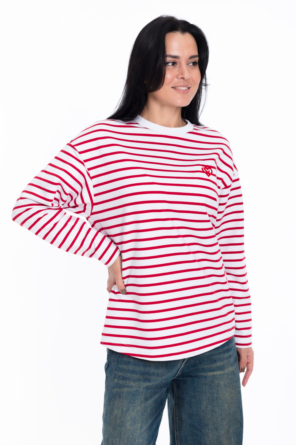 Женский лонгслив свободного кроя из белого футера с красной полоской - стильный и уютный вариант для повседневного образа. Удлиненные рукава и спущенная пройма добавляют современный и актуальный вид изделию.