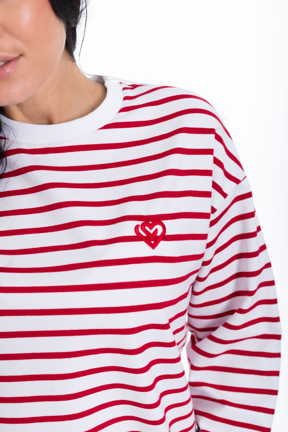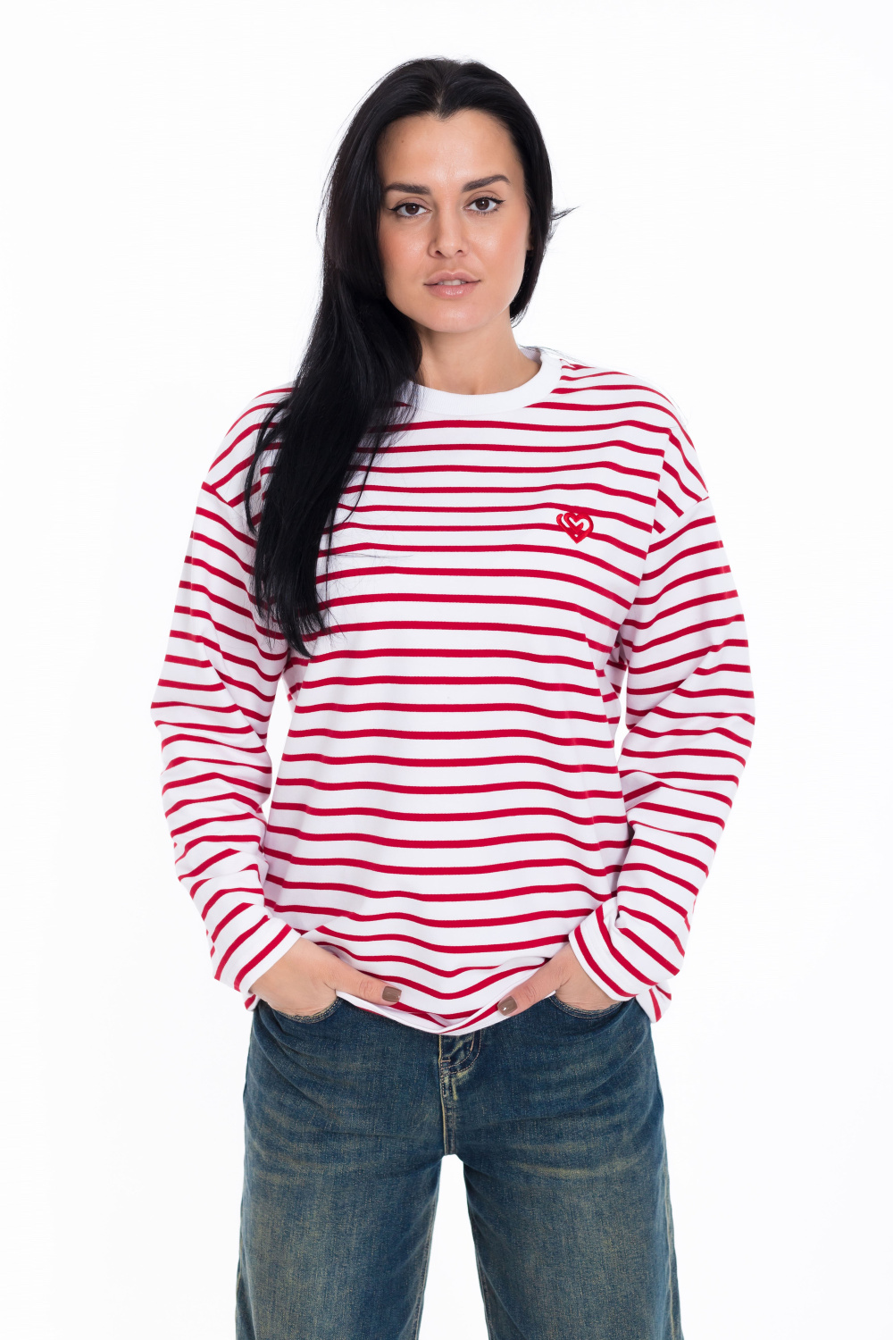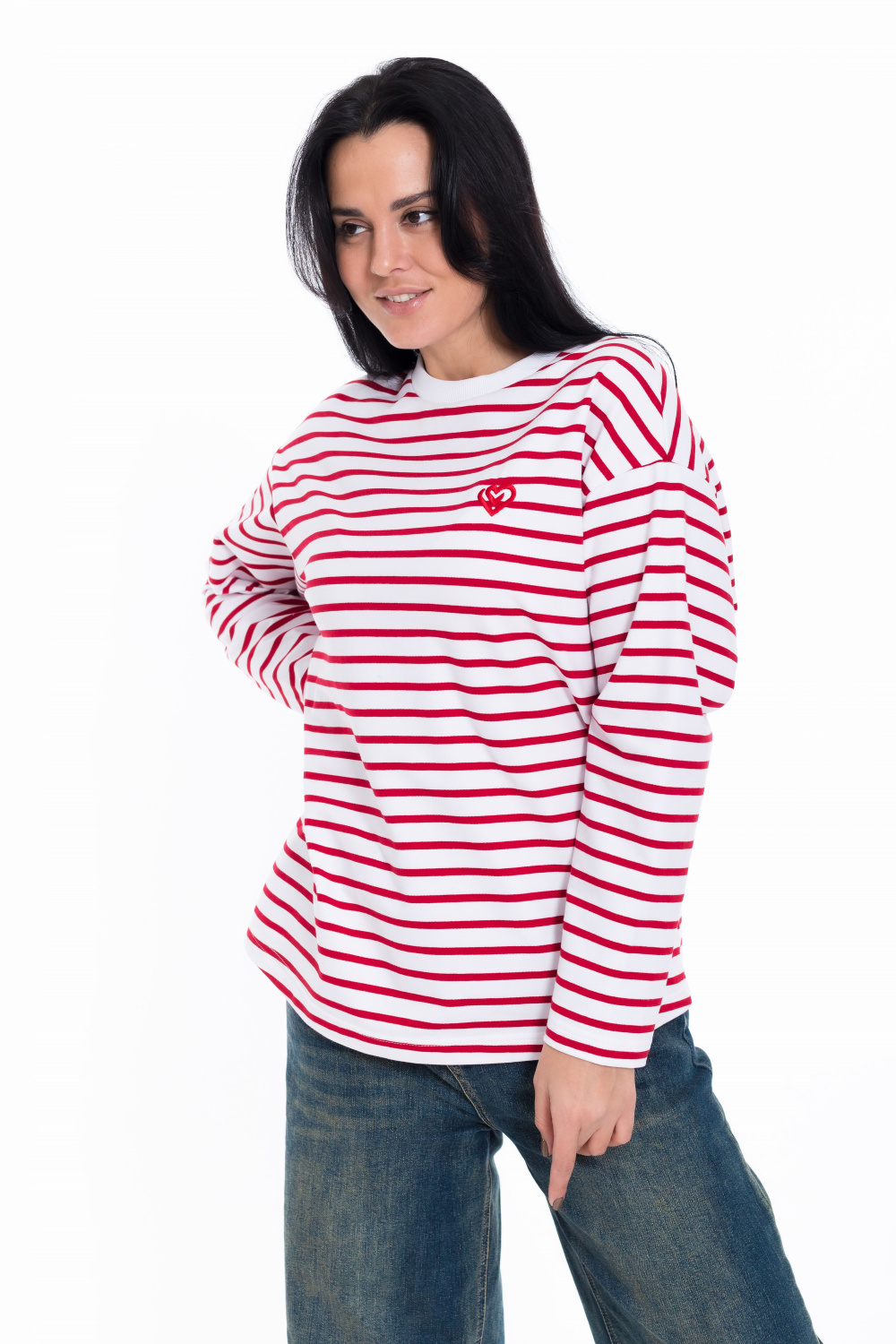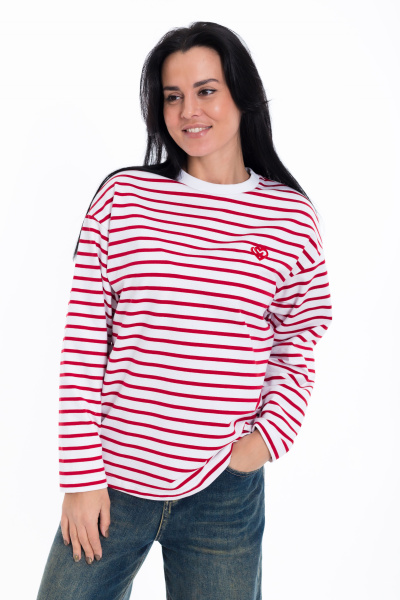 Женский лонгслив свободного кроя из белого футера с красной полоской - стильный и уютный вариант для повседневного образа. Удлиненные рукава и спущенная пройма добавляют современный и актуальный вид изделию.