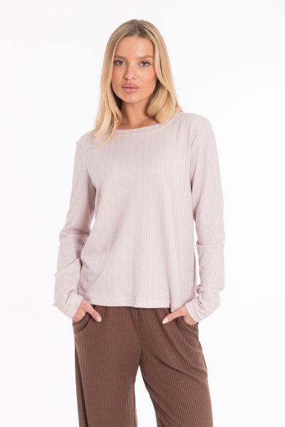 Женский лонгслив из кулирки фламли в вертикальную полоску. Модель свободного силуэта с втачным рукавом и круглой горловиной, оформленной планкой. Универсальный вариант для комфортных повседневных образов.