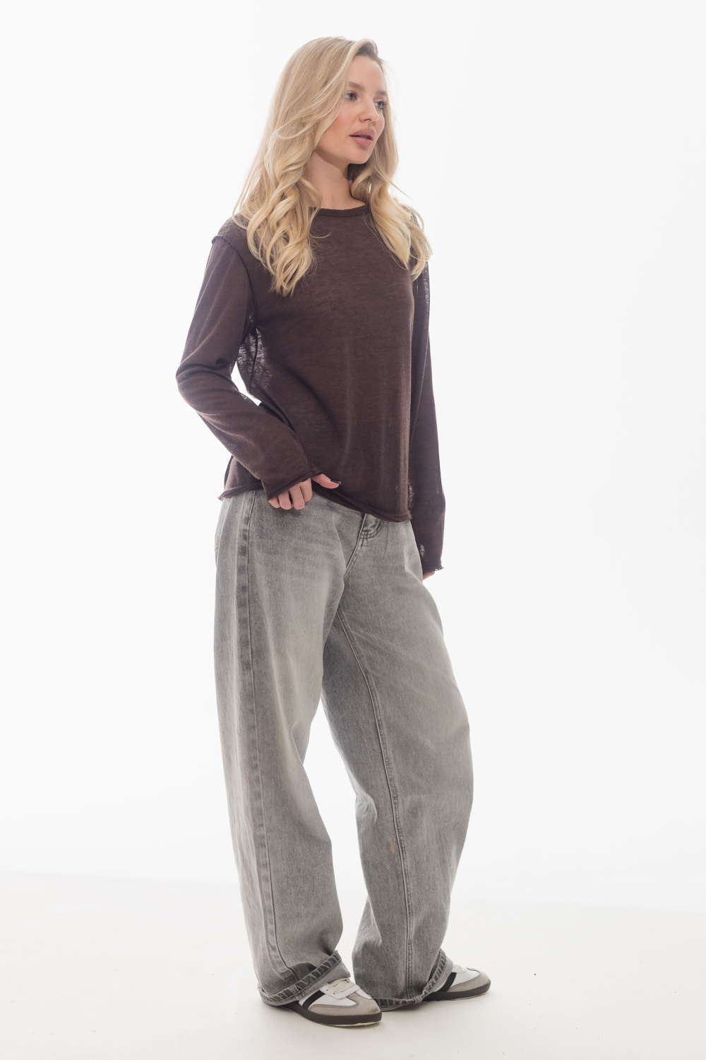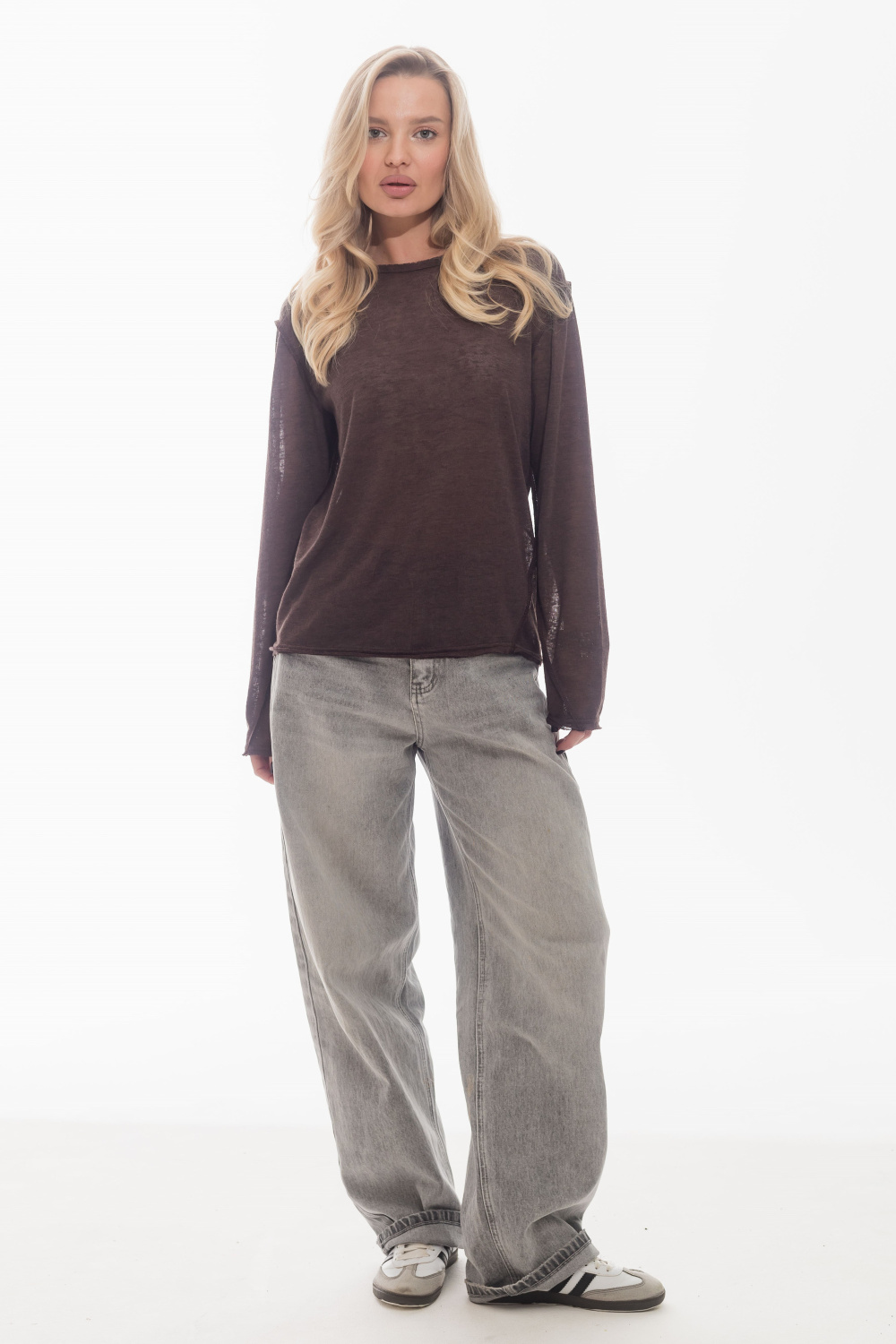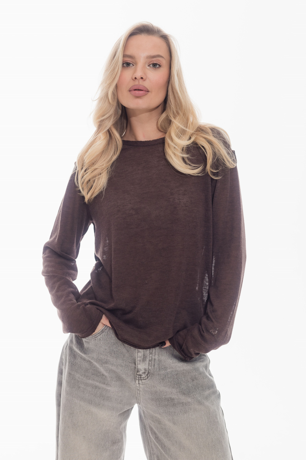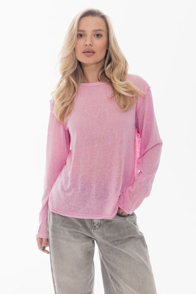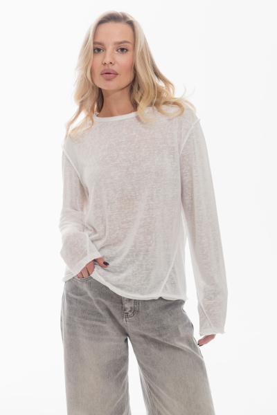 Лонгслив из поливискона с втачным длинным рукавом. По горловине, низу рукавов и низу изделия выполнен эффект необработанного края. Боковые швы смещены, что придаёт модели оригинальность. Лаконичный дизайн делает лонгслив универсальной основой для повседневных образов.