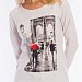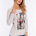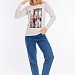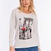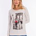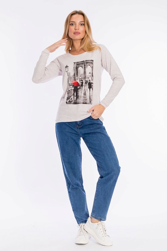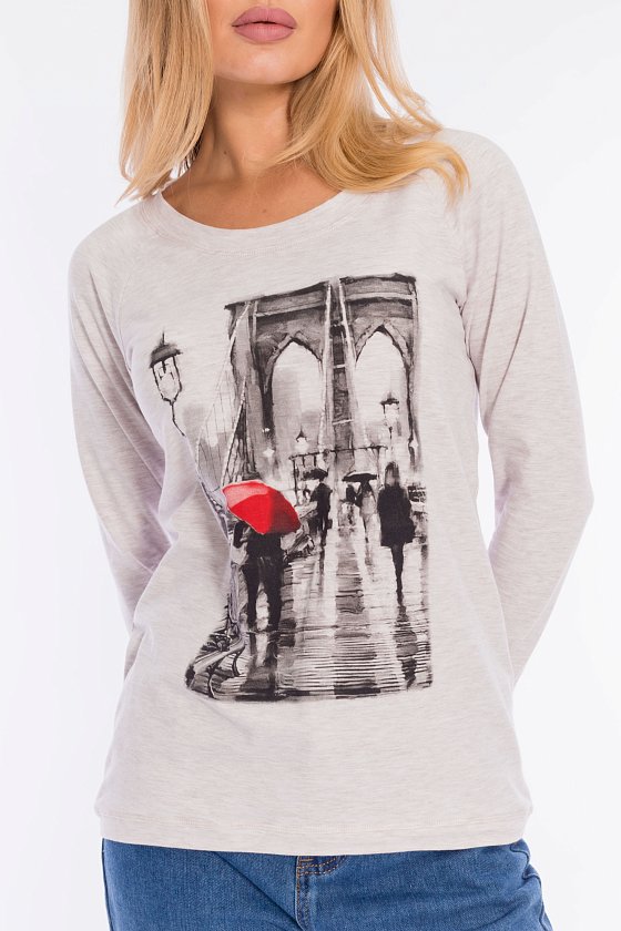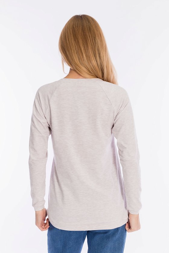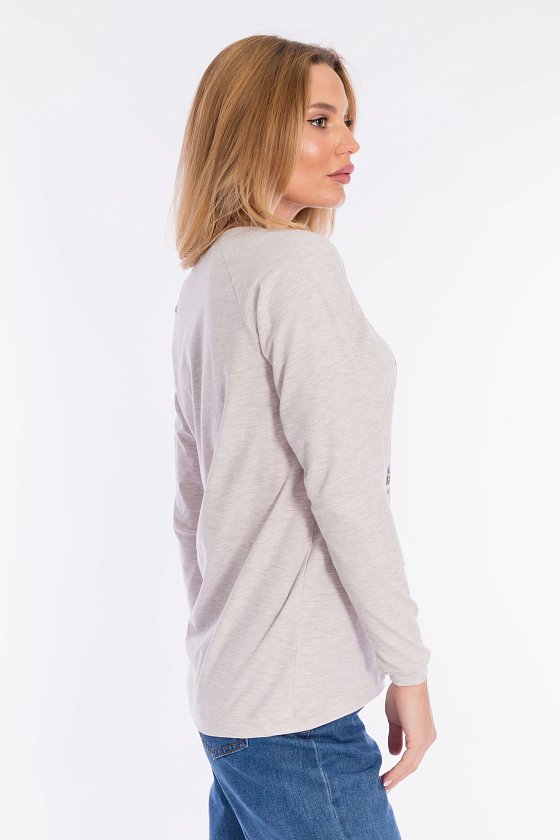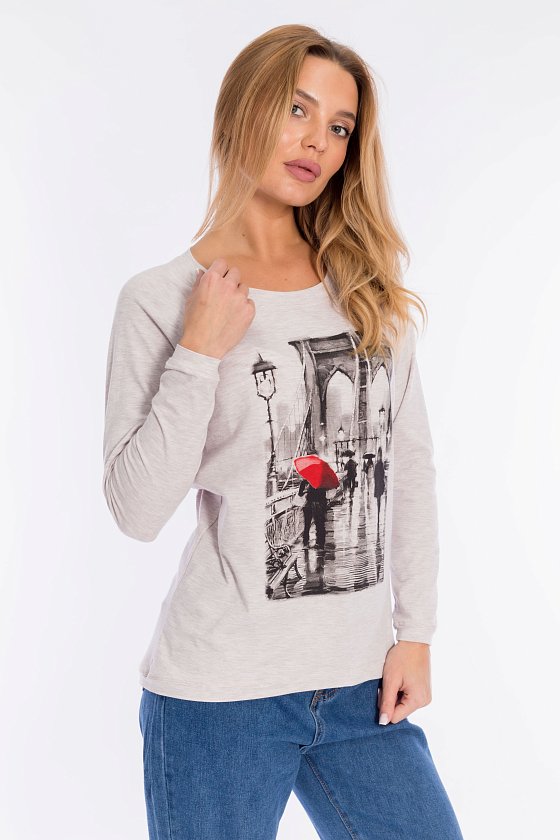 Толстовка выполнена из кулирки с лайкрой. Вырез горловины круглый, длинные рукава покроя реглан, спереди нанесён принт. Низ изделия разноуровневый, сзади длиннее, чем спереди. Горловина, низ рукавов и изделия отделаны эластичной тканью в цвет основного полотна.