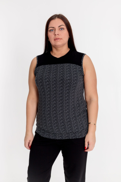 Майка выполнена из вискозы с набивным рисунком. Спереди и на спинке однотонные кокетки. Низ изделия с притачным поясом.