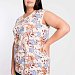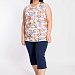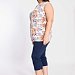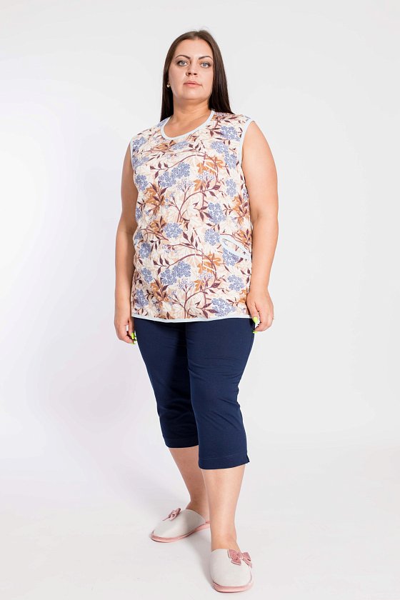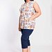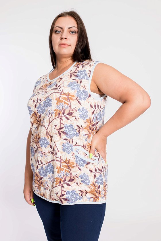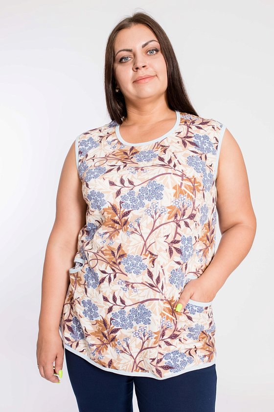 Майка женская выполнена из лёгкой хлопковой ткани с набивным рисунком. Крой прямой, вырез горловины круглый. Спереди расположены два накладных кармана. Горловина, проймы, карманы и низ изделия обработаны бейкой контрастного цвета.