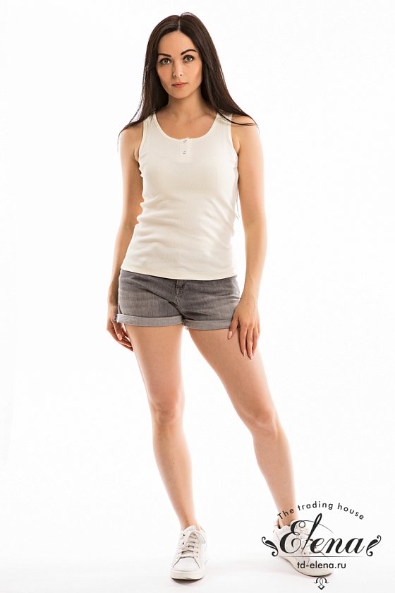 Майка женская на широких бретелях, с круглым вырезом горловины. Силуэт облегающий, майка выполнена из полотна в рубчик (кашкорсе-вискоза), спереди планка на кнопках.