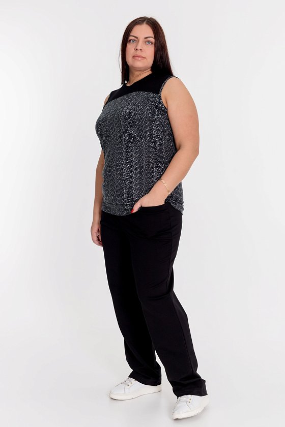 Майка выполнена из вискозы с набивным рисунком. Спереди и на спинке однотонные кокетки. Низ изделия с притачным поясом.