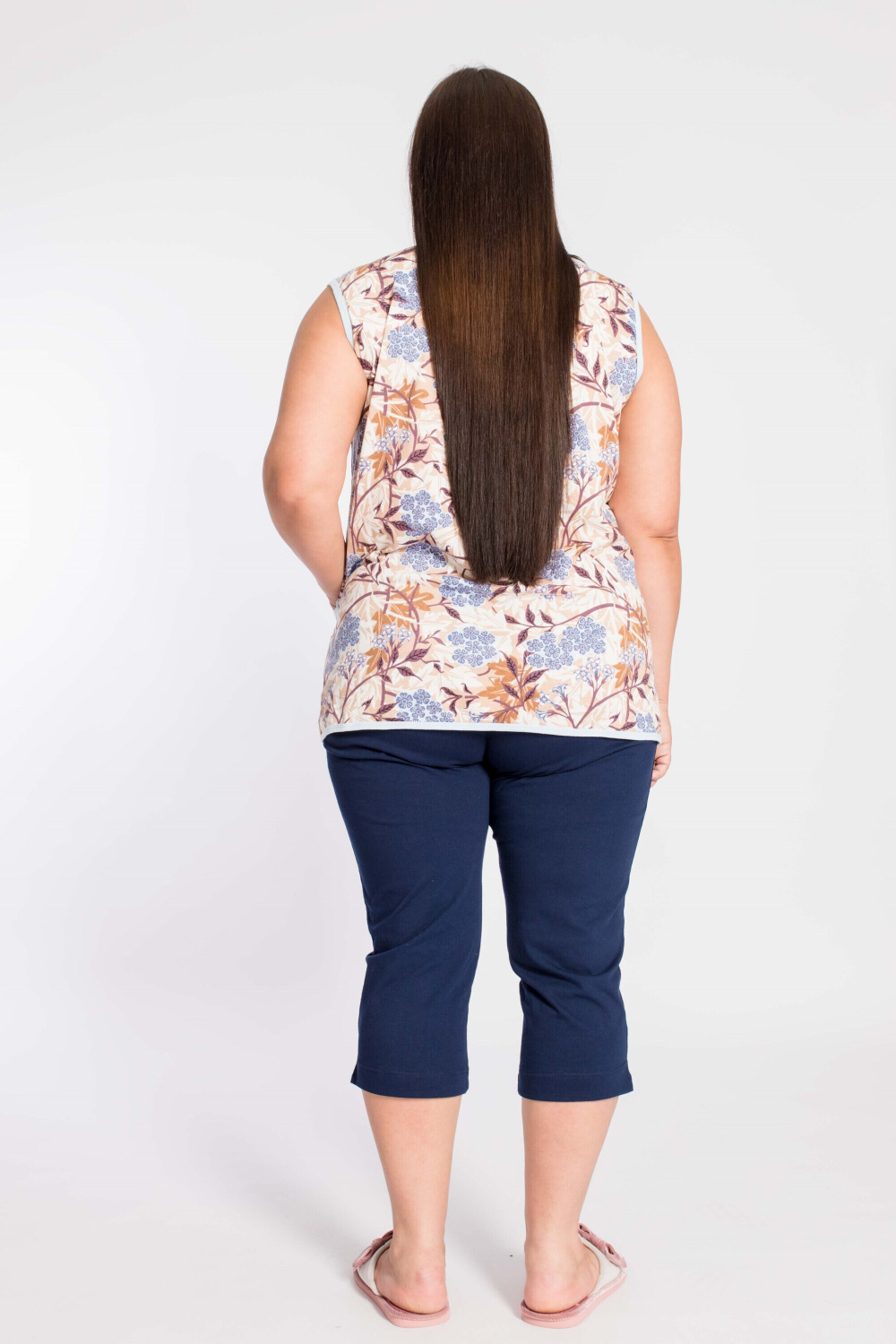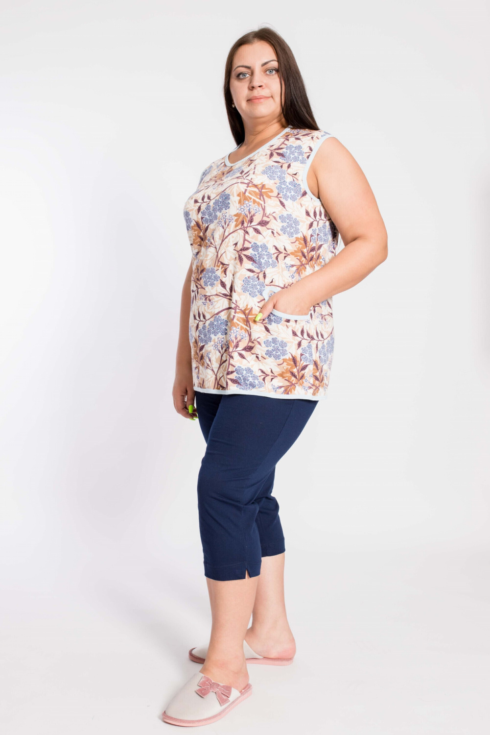 Майка женская выполнена из лёгкой хлопковой ткани с набивным рисунком. Крой прямой, вырез горловины круглый. Спереди расположены два накладных кармана. Горловина, проймы, карманы и низ изделия обработаны бейкой контрастного цвета.
