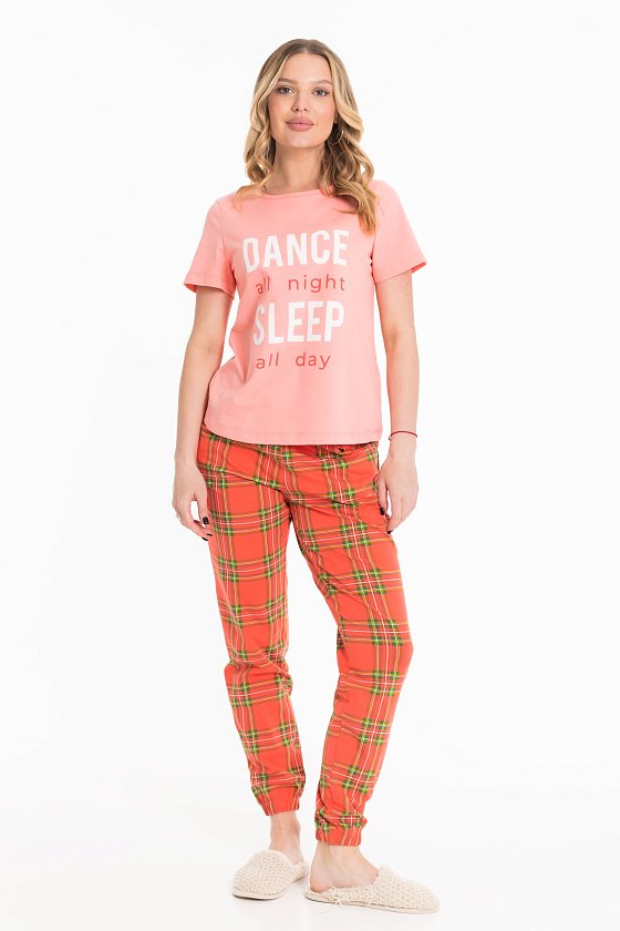 Женская пижама — отличный выбор для комфортного сна или отдыха. Она изготовлена из мягкого и приятного к телу хлопкового полотна. Футболка с втачным рукавом и круглым вырезом горловины. Спереди расположен принт, который добавляет яркости и оригинальности. Брюки с боковыми карманами и поясом на резинке. Такая пижама идеально подойдёт для домашнего отдыха.