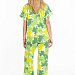 Женская пижама - рубашка и брюки, изготовлена из мягкой и приятной к телу ткани — кулирки с набивным рисунком. Рубашка свободного силуэта с цельнокроеным коротким рукавом и застёжкой на пуговицах обеспечивает свободу движений. Отложной воротник и накладной карман на полочке придают изделию оригинальность. Брюки чуть расширенные к низу, с широким поясом на резинке обеспечивают комфортную посадку. Манжеты на рукавах, брюках и верхней части кармана с кантом белого цвета, добавляют изюминку и индивидуальность вашему образу. Изготовленная из натуральной ткани, пижама обеспечит комфорт в течение всего дня.