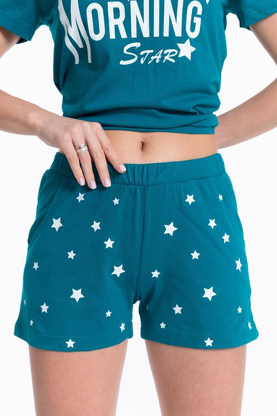 Женская пижама из кулирки — это отличный выбор для комфортного сна и отдыха. Она состоит из футболки с коротким втачным рукавом и шорт. Футболка украшена принтом спереди и имеет круглый вырез горловины, обработанный бейкой, что придаёт изделию аккуратный вид. Шорты с боковыми карманами и поясом на резинке обеспечивают свободу движений и удобную посадку.