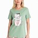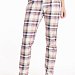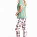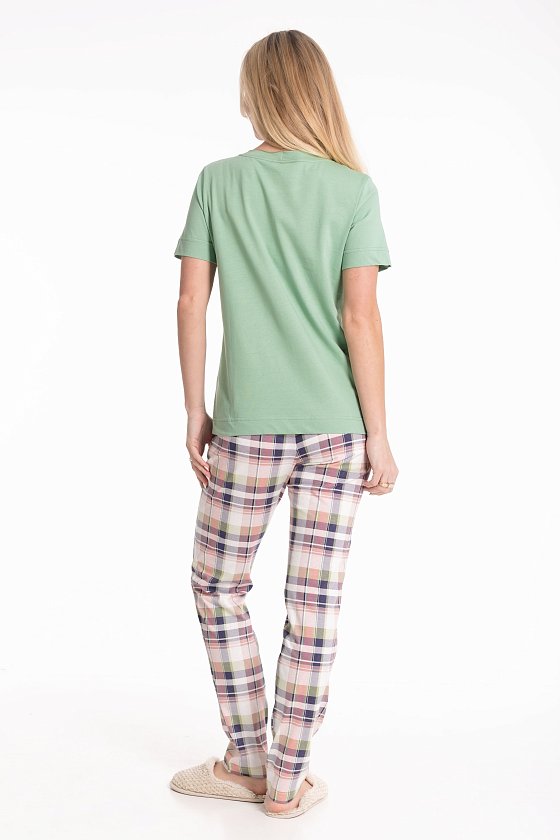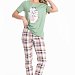Пижама выполнена из хлопкового полотна. Футболка однотонная, с коротким втачным рукавом и планкой по горловине. Спереди нанесён принт. Брюки из полотна с набивным рисунком, пояс на резинке.