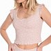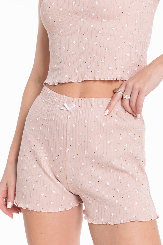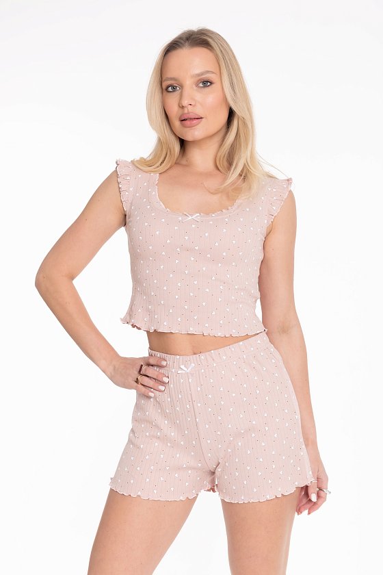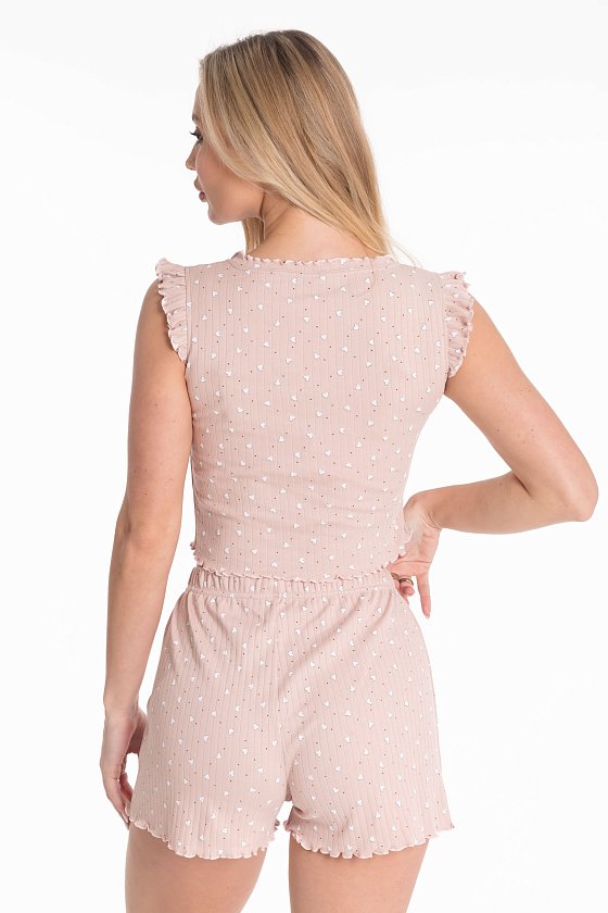 Пижама из мягкого и приятного к телу интерлока состоит из топа и шорт. Топ оформлен милыми "крылышками" по проймам и аккуратной отделкой горловины. Шорты на удобной резинке, без карманов. Пижама декорирована бантиками и отделкой на микрооверлоке, придающей образу нежность и изящность.