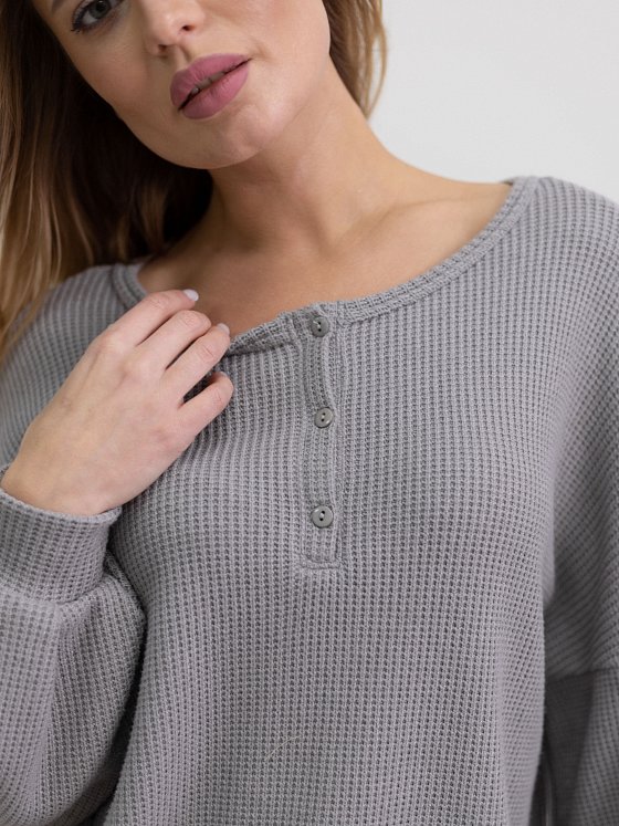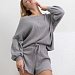 Женская пижама из вязаного полотна — уютный комплект, созданный для комфортного отдыха и стильных домашних образов. Верх выполнен со спущенной линией плеч, свободным силуэтом и небольшой планкой на пуговицах, что добавляет акцент и позволяет регулировать посадку по горловине. Рукава – объемные, на манжете, создают расслабленный и стильный силуэт. Шорты на эластичном поясе с декоративным шнуром обеспечивают удобную посадку и не сковывают движений. Мягкое вязаное полотно приятно к телу, хорошо дышит и дарит ощущение тепла и уюта.