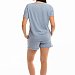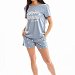 Комплект выполнен из кулирки, 100% хлопок, состоит из шорт и футболки с коротким втачным рукавом. Шорты с боковыми карманами и притачным поясом на резинке. Футболка с принтом спереди, круглый вырез горловины обработан бейкой.