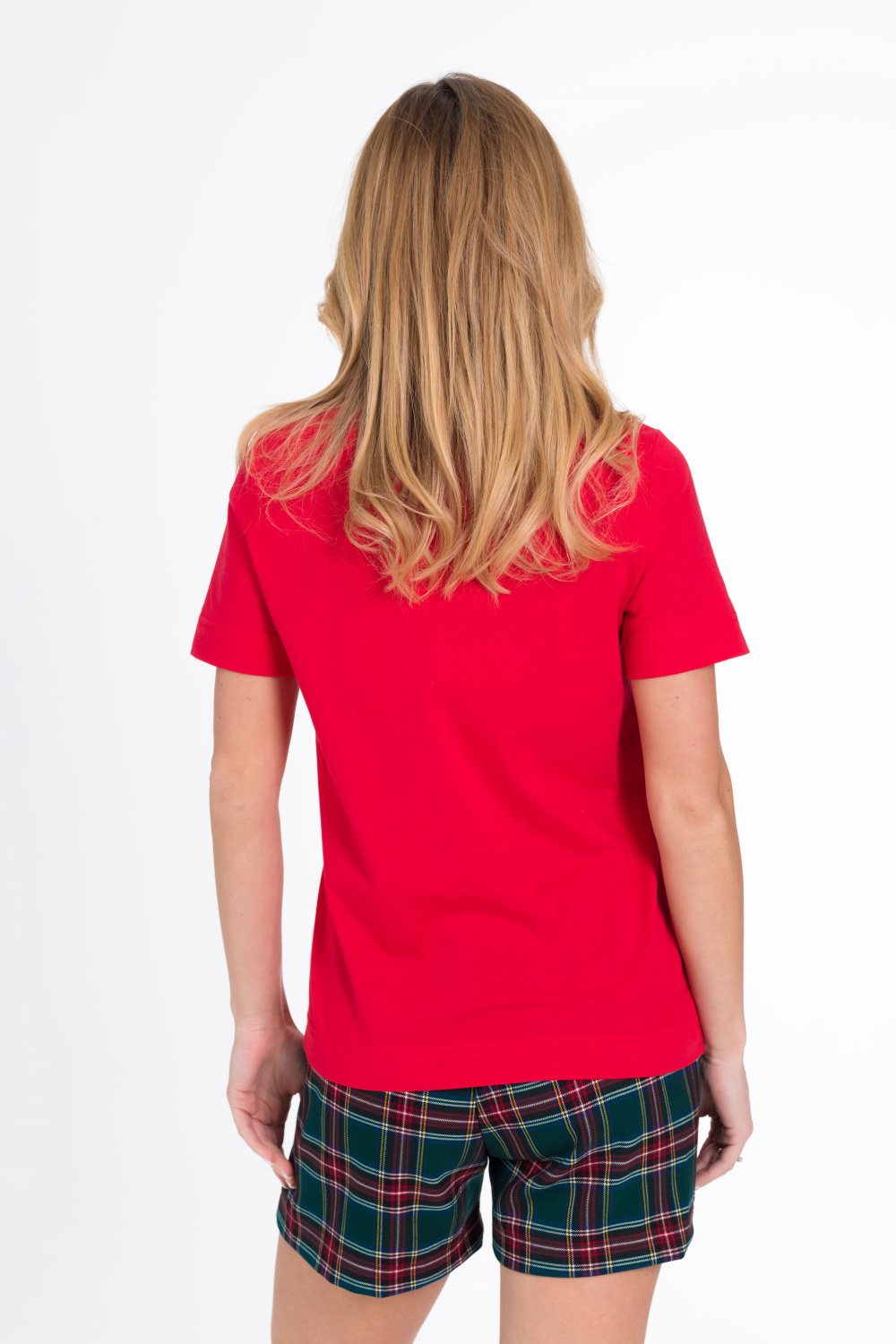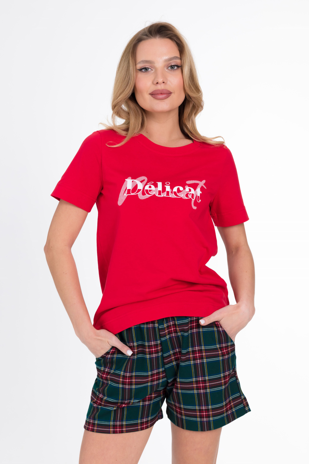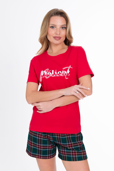 Пижама женская. Футболка однотонная, с коротким втачным рукавом и планкой по горловине, спереди нанесён принт.