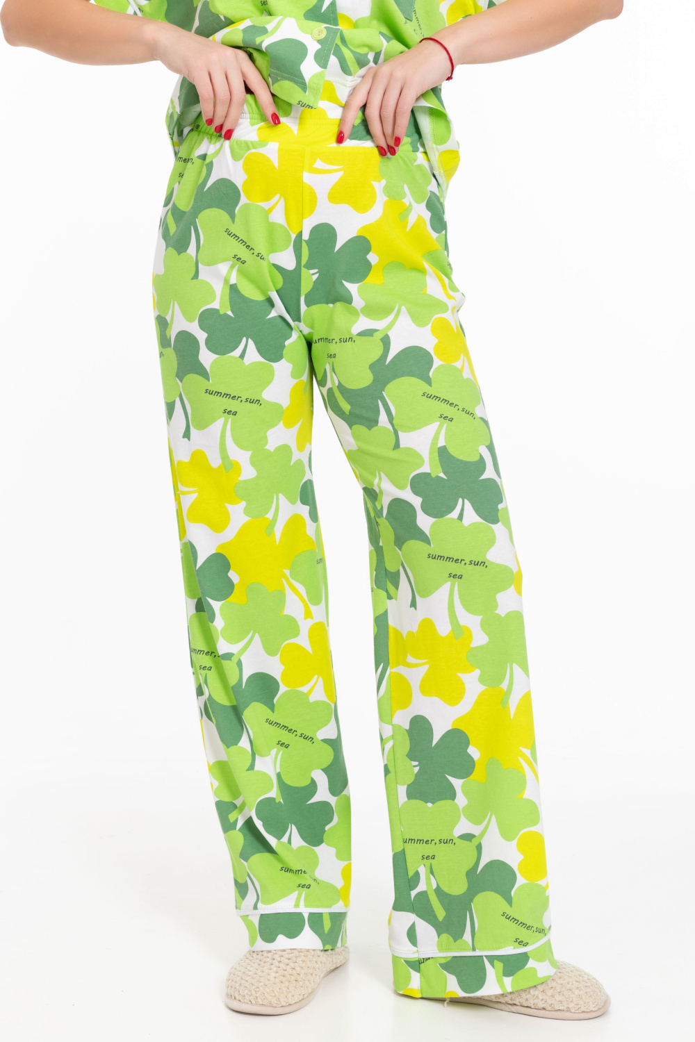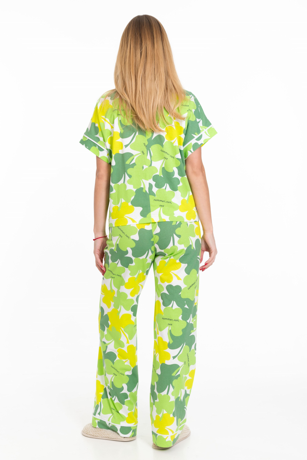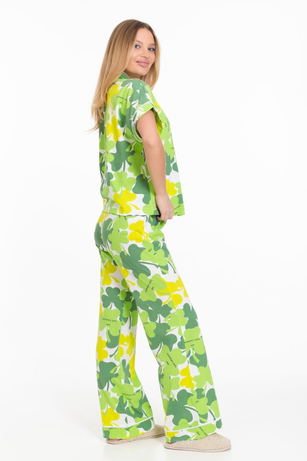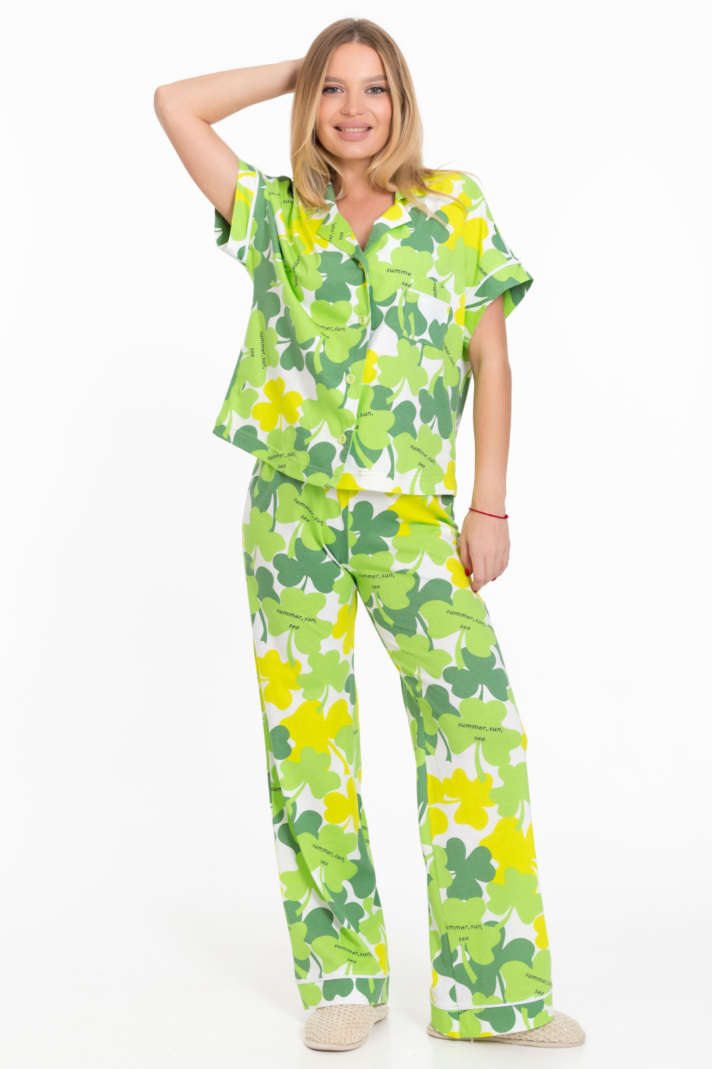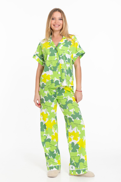 Женская пижама - рубашка и брюки, изготовлена из мягкой и приятной к телу ткани — кулирки с набивным рисунком. Рубашка свободного силуэта с цельнокроеным коротким рукавом и застёжкой на пуговицах обеспечивает свободу движений. Отложной воротник и накладной карман на полочке придают изделию оригинальность. Брюки чуть расширенные к низу, с широким поясом на резинке обеспечивают комфортную посадку. Манжеты на рукавах, брюках и верхней части кармана с кантом белого цвета, добавляют изюминку и индивидуальность вашему образу. Изготовленная из натуральной ткани, пижама обеспечит комфорт в течение всего дня.
