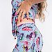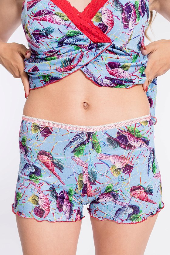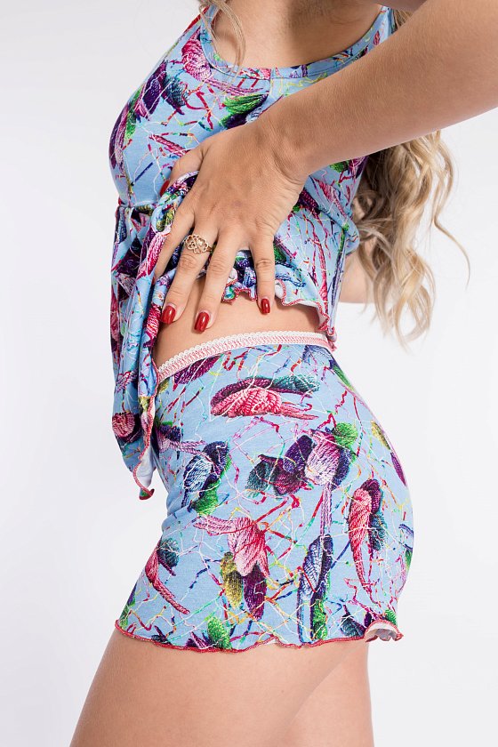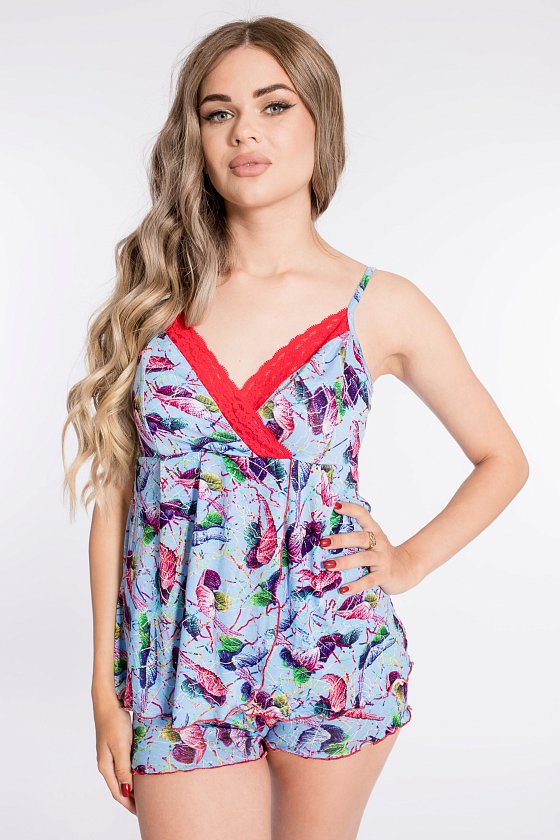 Пижама выполнена из вискозы, состоит из шорт и топа. Топ на тонких бретелях, срезы чашечек украшены кружевом, нижняя часть полочки на запах. По поясу шорт декоративная резинка.