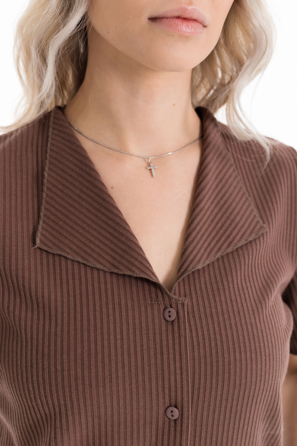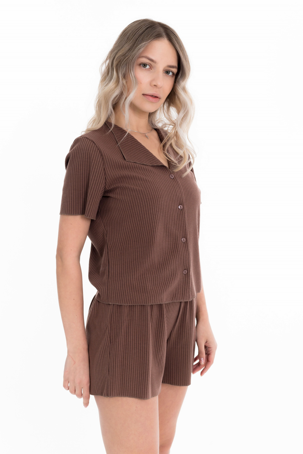 Пижама выполнена из кашкорсе с добавлением вискозы. Рубашка с коротким рукавом и застежкой на пуговицы спереди. Шорты свободные, с поясом на резине.