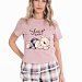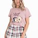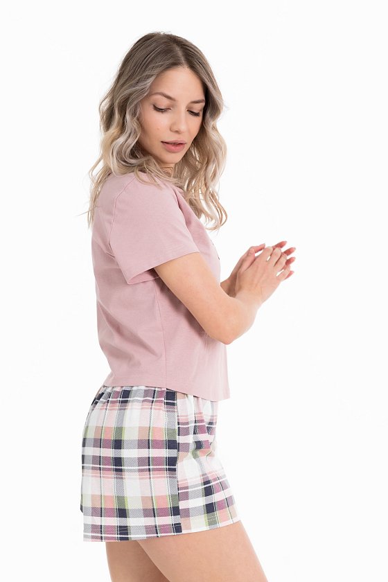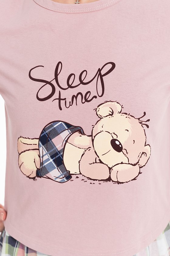 Пижама выполнена из кулирки, 100% хлопок, состоит из шорт с высокой посадкой и укороченной футболки. Футболка с принтом спереди и круглым вырезом горловины, оформленным бейкой. Пояс шорт на резине.