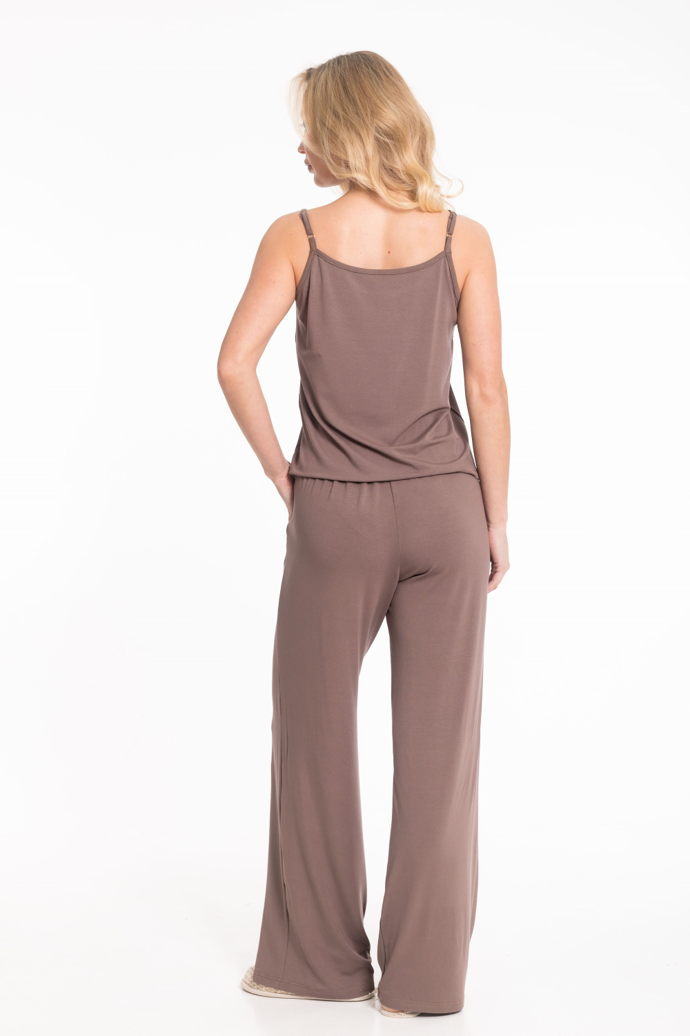 Пижама из мягкой однотонной вискозы состоит из топа на бретелях и брюк. Топ с регулируемыми по длине бретелями позволяет настроить посадку по фигуре. Брюки выполнены с удобным поясом на резинке и боковыми карманами, что обеспечивает комфорт при носке. Лёгкое вискозное полотно приятно к телу и идеально подходит для сна и домашнего отдыха.