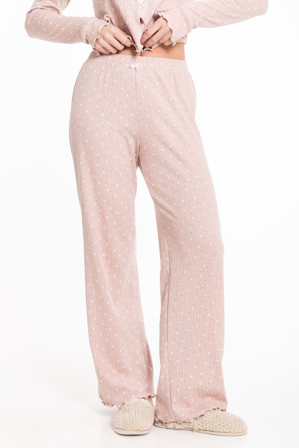 Пижама выполнена из мягкого и приятного к телу интерлока. Комплект состоит из кофточки прилегающего силуэта и брюк. Кофточка, без застежки спереди, дополнена длинным рукавом на аккуратной манжете с разрезом. Брюки на удобной резинке, без карманов. Образ завершают изящные детали: бантики и отделка на микрооверлоке, которые придают пижаме особую нежность.