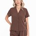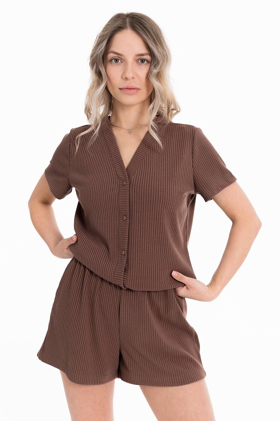 Пижама выполнена из кашкорсе с добавлением вискозы. Рубашка с коротким рукавом и застежкой на пуговицы спереди. Шорты свободные, с поясом на резине.