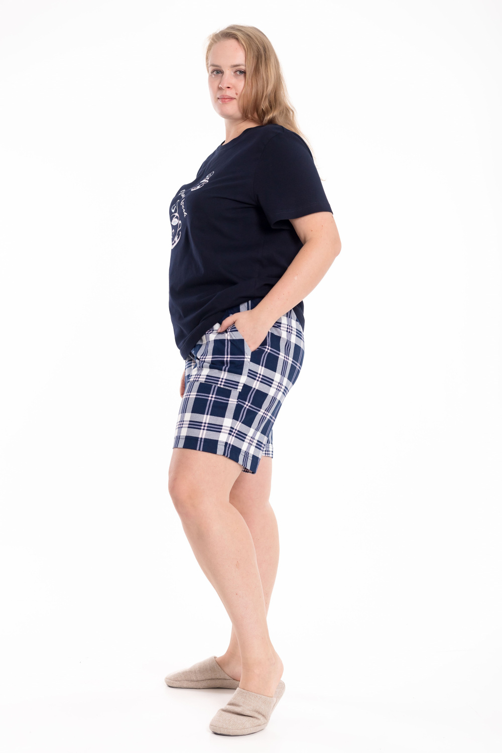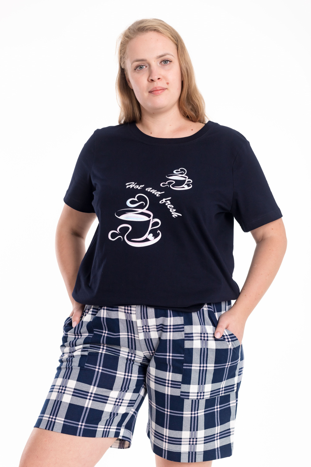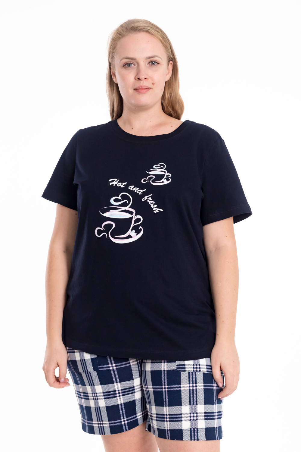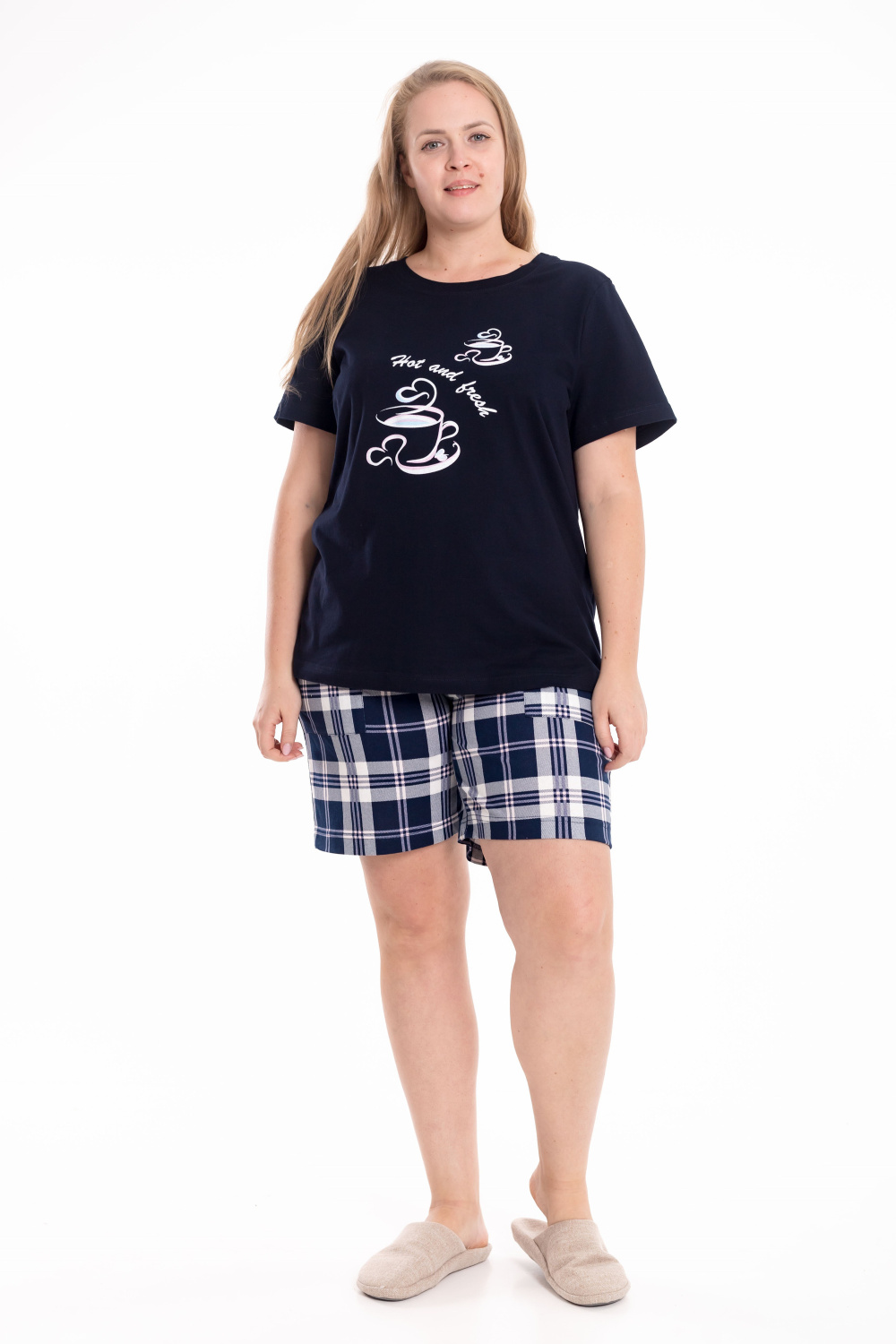 Женская пижама — отличный выбор для комфортного сна и отдыха. Пижама состоит из футболки и шорт, выполненных из мягкого хлопкового полотна. Футболка однотонная, с коротким рукавом и принтом спереди. Шорты из кулирки с набивным рисунком, с боковыми карманами и поясом на резинке, что обеспечивает свободу движений и комфортную посадку.