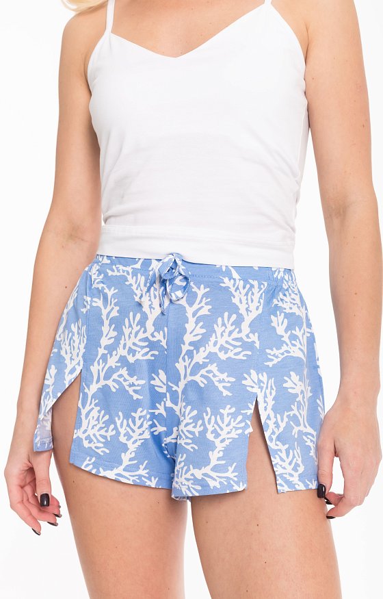Пижама выполнена из хлопкового полотна с набивным рисунком «кораллы» и состоит из однотонного топа на бретелях и шорт. Топ выполнен из кулирки с лайкрой, облегает фигуру и имеет длину до линии талии, подчёркивая силуэт и создавая аккуратный, изящный образ. Шорты из кулирки имеют декоративные швы на передних половинках, внизу — аккуратные разрезы, добавляющие модели легкость и женственность. Пояс средней ширины оформлен бантиком и по центру без резинки, что делает посадку более комфортной и деликатной.