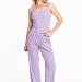 Женская пижама из мягкого кашкорсе с набивным рисунком состоит из брюк и майки на бретелях. Брюки выполнены с притачным поясом и удобными боковыми карманами. Майка прилегающего к телу силуэта и длиной чуть ниже талии, что обеспечивает комфорт и свободу движений во время отдыха.