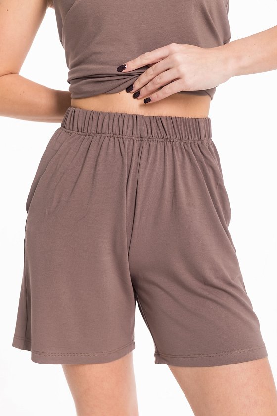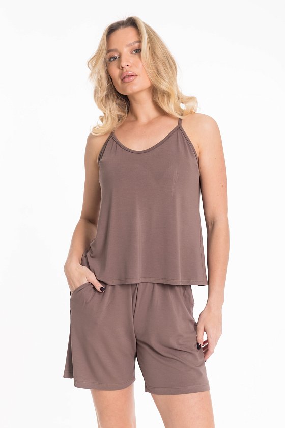 Пижама из мягкой однотонной вискозы — лёгкий и удобный комплект для сна и отдыха. В комплект входят топ и шорты. Топ с регулируемыми бретелями идеально садится по фигуре, а спинка из двух деталей на запах добавляет оригинальности и лёгкости образу. Шорты длиной до середины бедра выполнены с поясом на мягкой резинке и боковыми карманами, обеспечивающими комфорт и практичность.