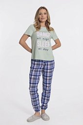 Женская пижама — отличный выбор для комфортного сна и отдыха. Пижама состоит из футболки и шорт, выполненных из мягкого хлопкового полотна. Футболка однотонная, с коротким рукавом и принтом спереди. Шорты из кулирки с набивным рисунком, с боковыми карманами и поясом на резинке, что обеспечивает свободу движений и комфортную посадку.