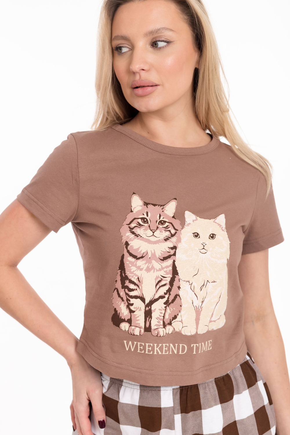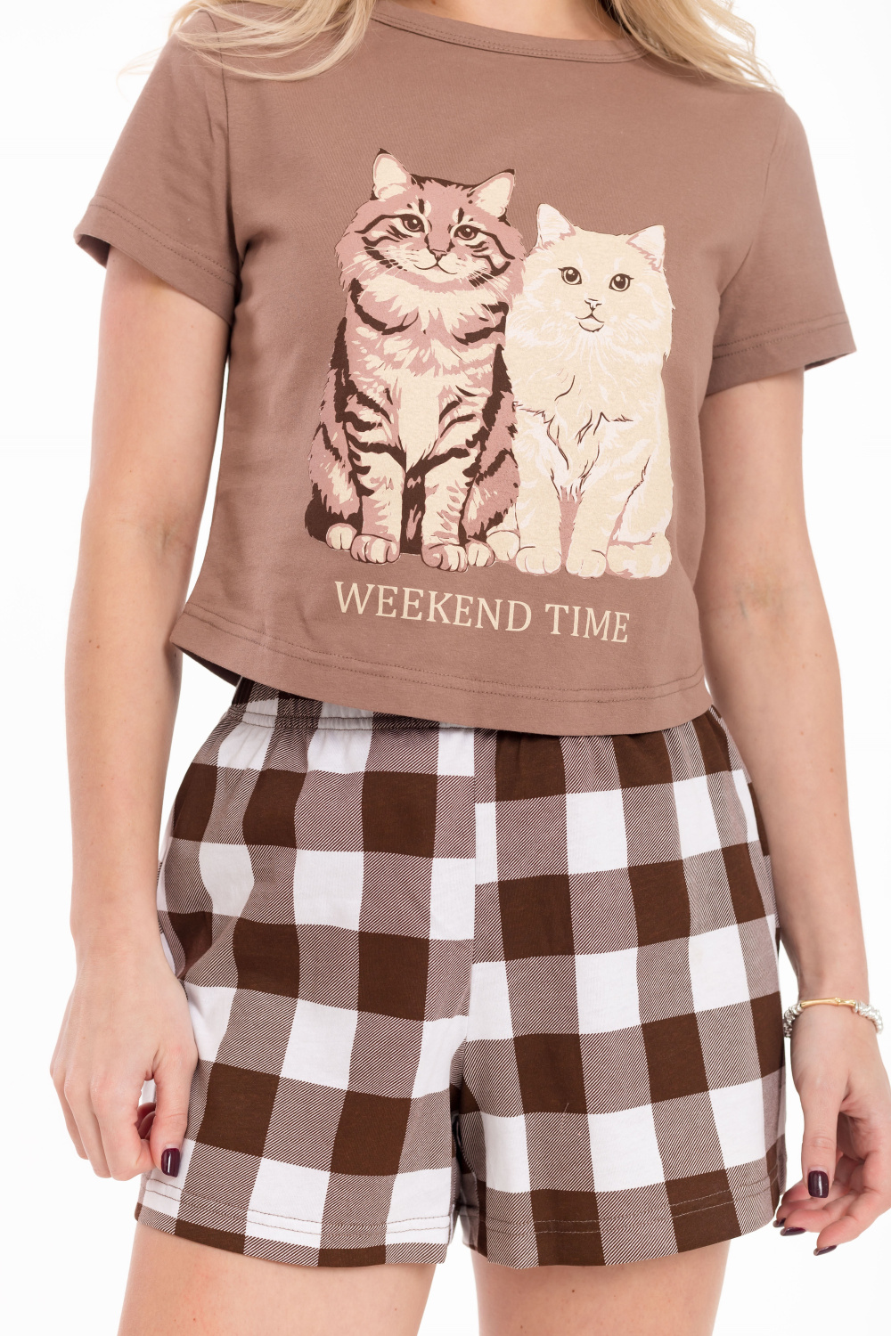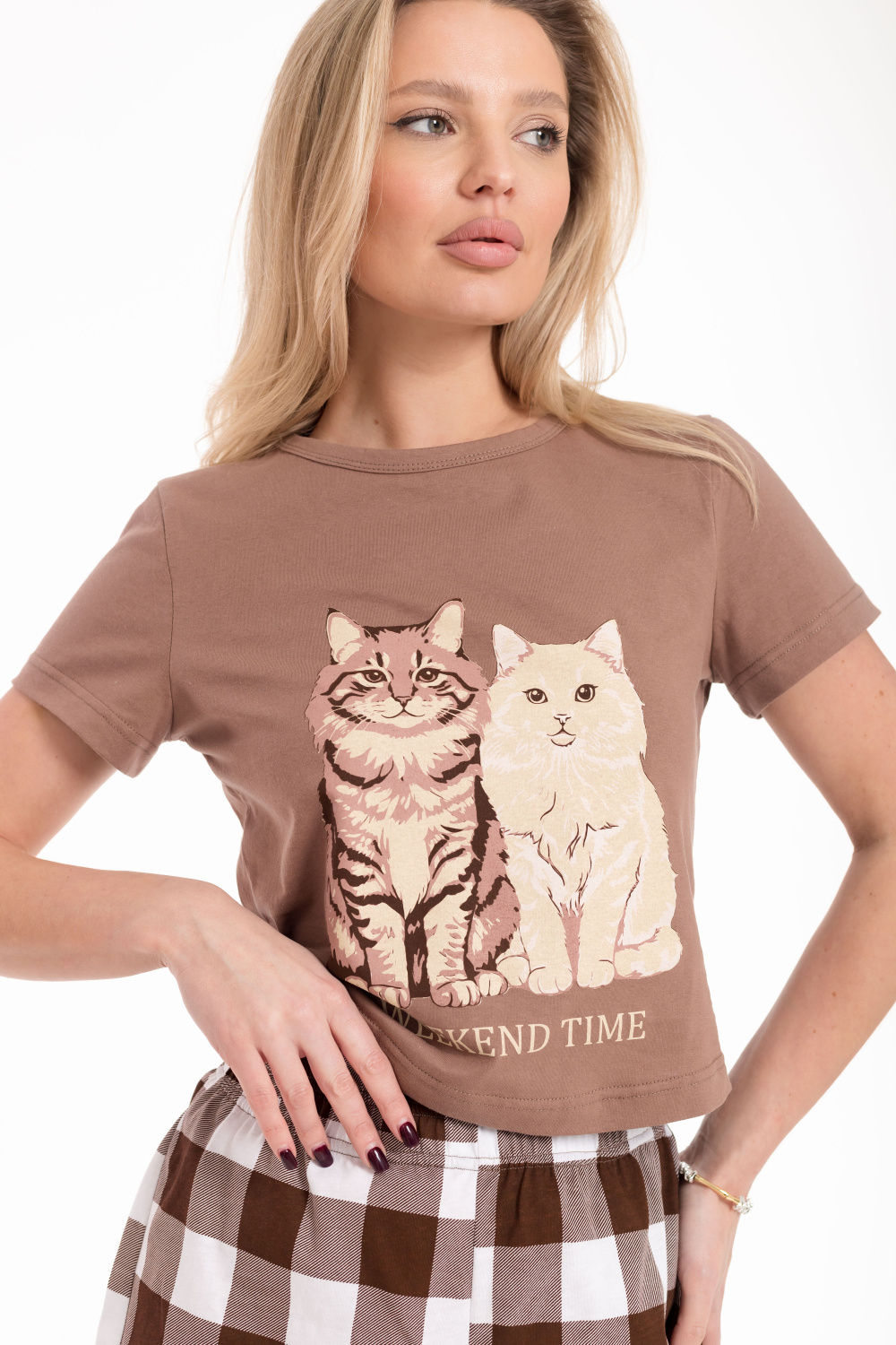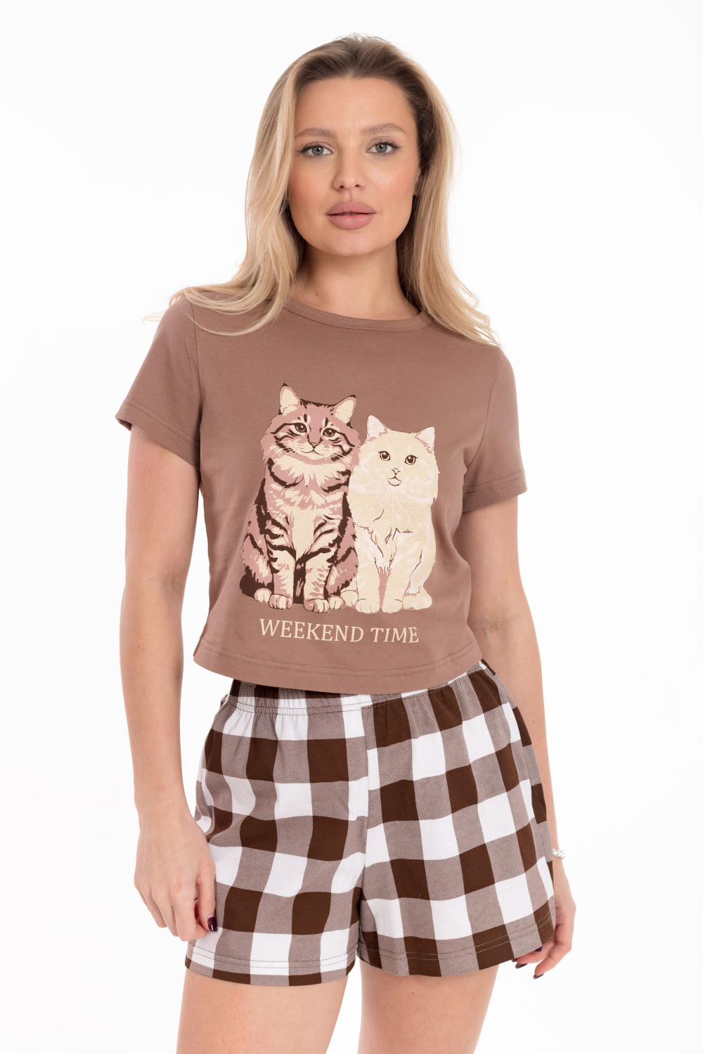 Пижама выполнена из кулирки, 100% хлопок, состоит из шорт с высокой посадкой и укороченной футболки. Футболка с принтом спереди и круглым вырезом горловины, оформленным бейкой. Пояс шорт на резине.