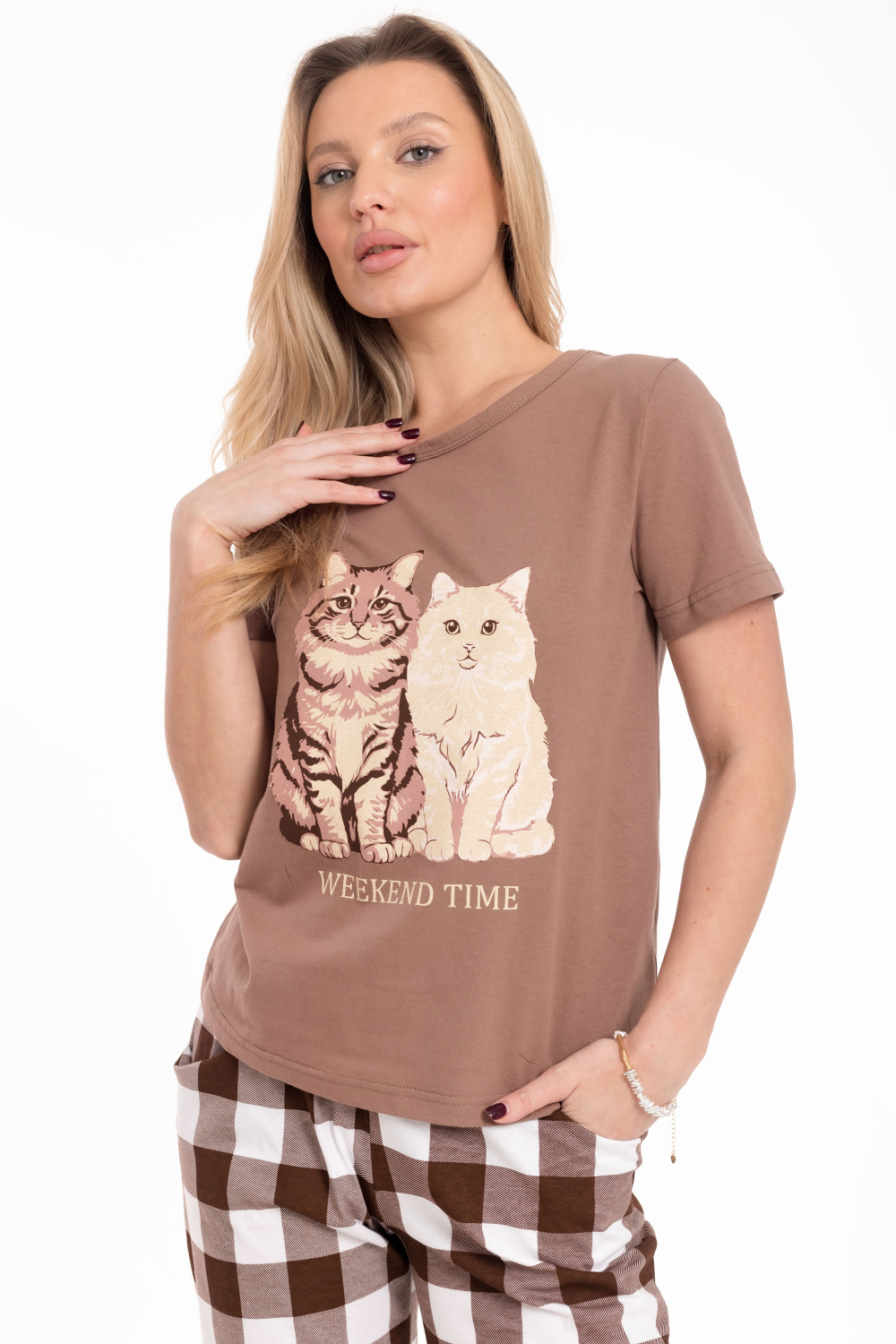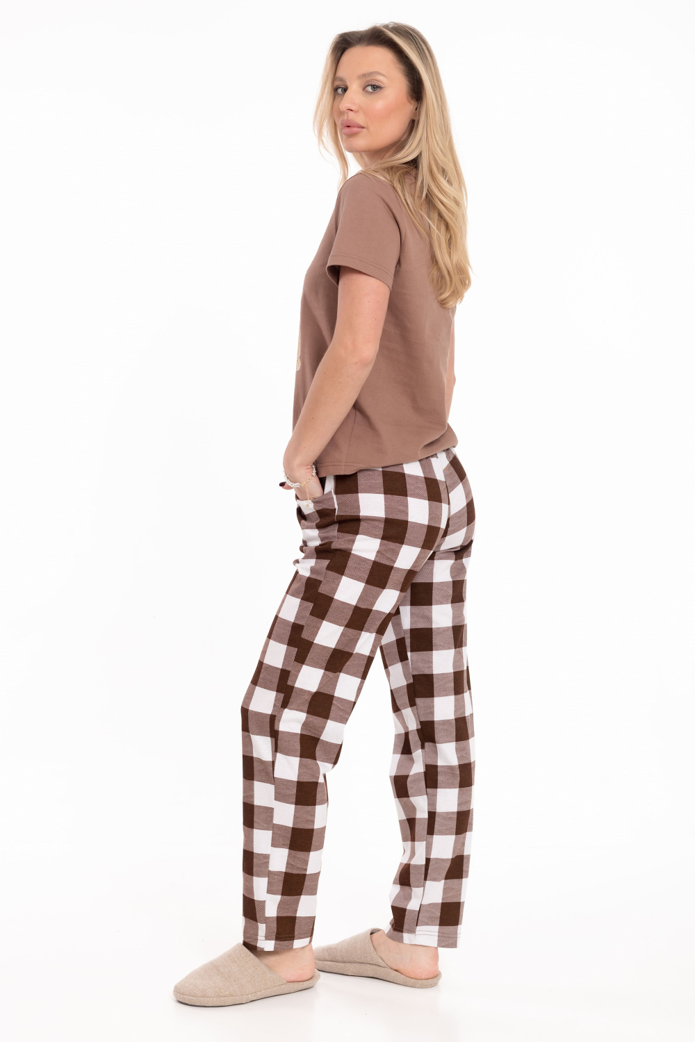 Женская пижама из хлопкового полотна представляет собой стильный и удобный вариант для повседневного использования. Футболка однотонная, с коротким втачным рукавом и планкой по горловине. Спереди нанесен принт, который добавляет изюминку и индивидуальность вашему образу. Брюки из полотна с набивным рисунком прямого кроя и пояс на резинке, обеспечивают удобную посадку и комфорт в движении. По бокам размещены карманы, что добавляет функциональность и практичность этому комплекту.